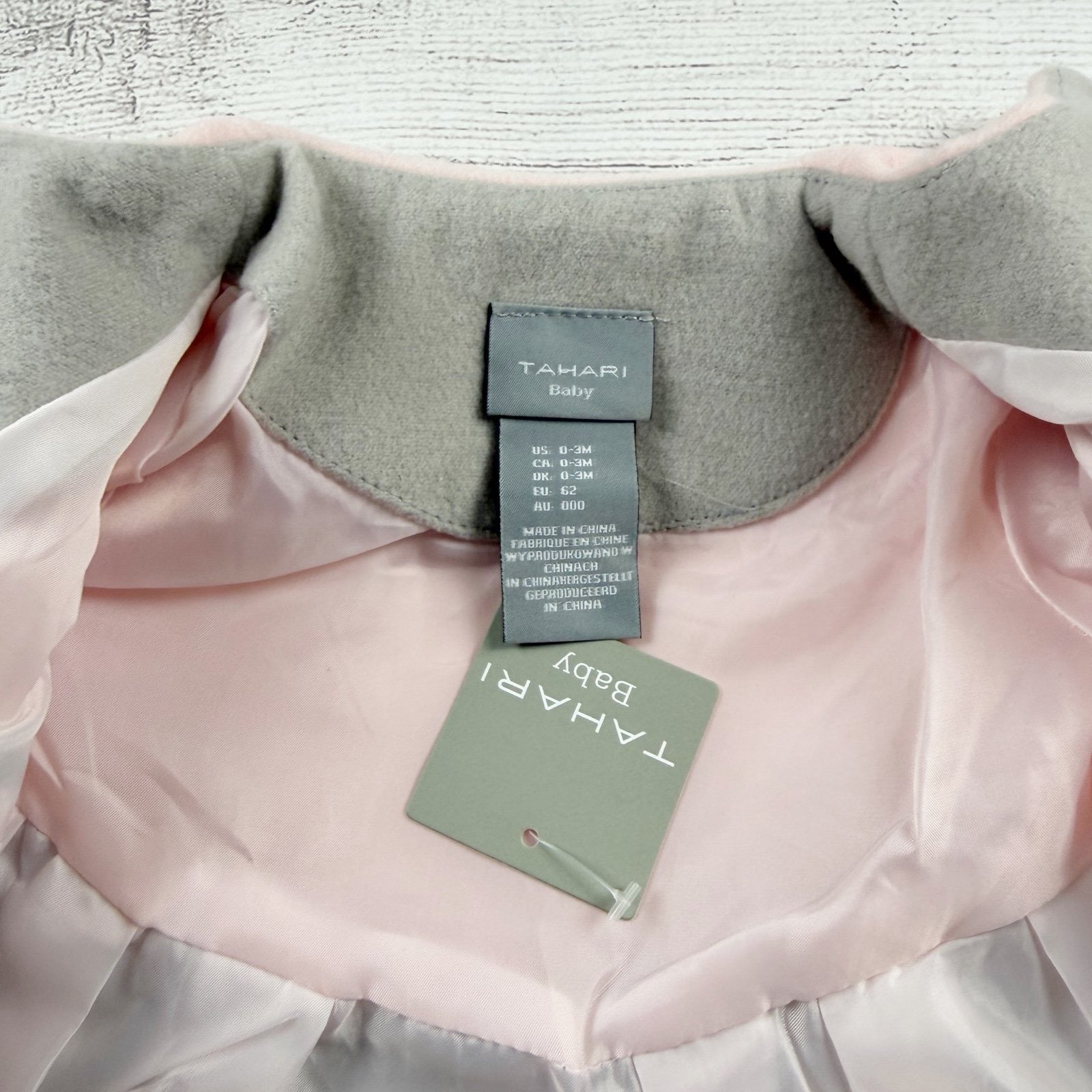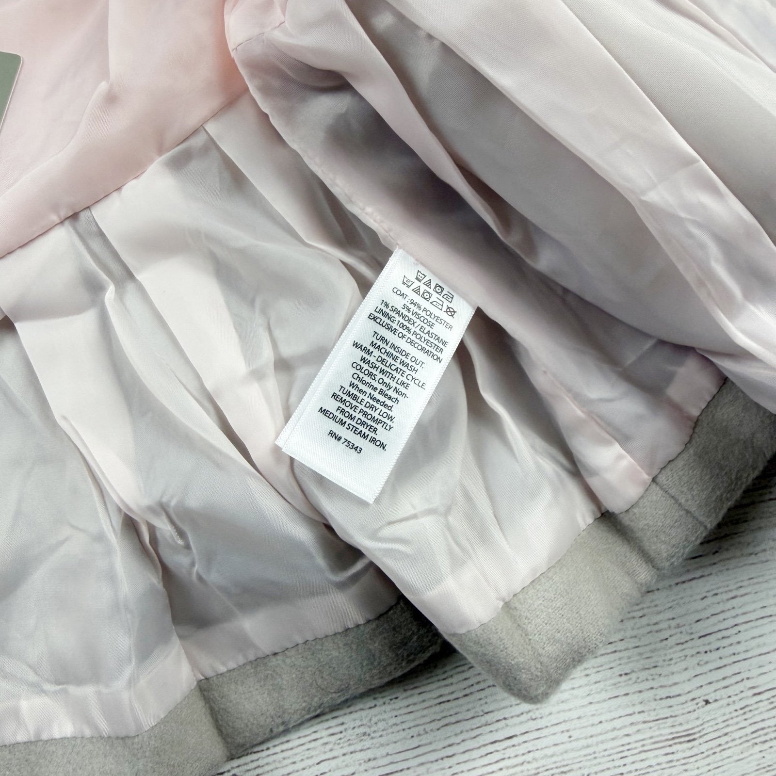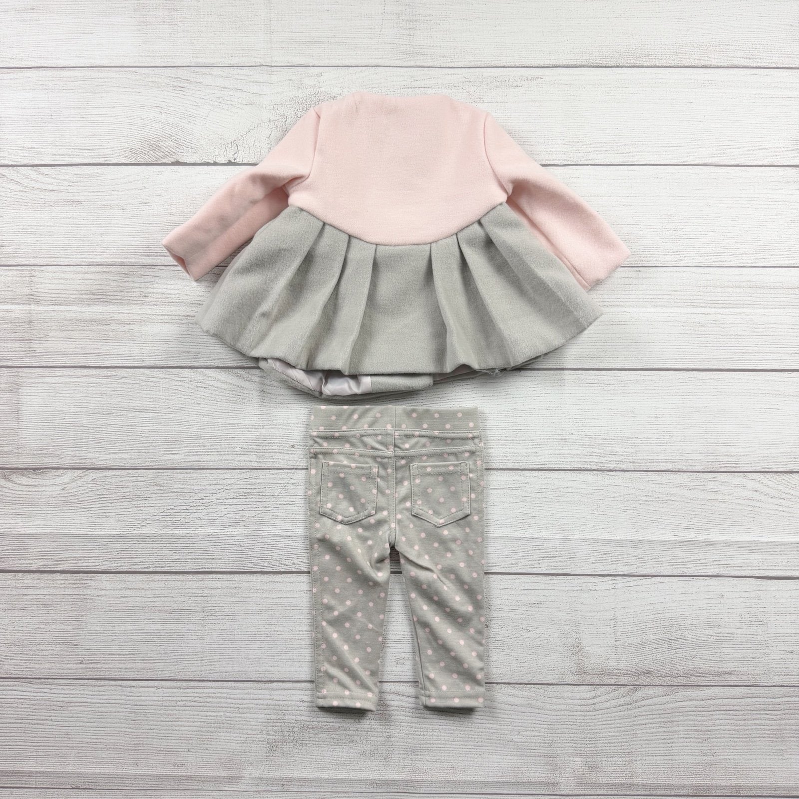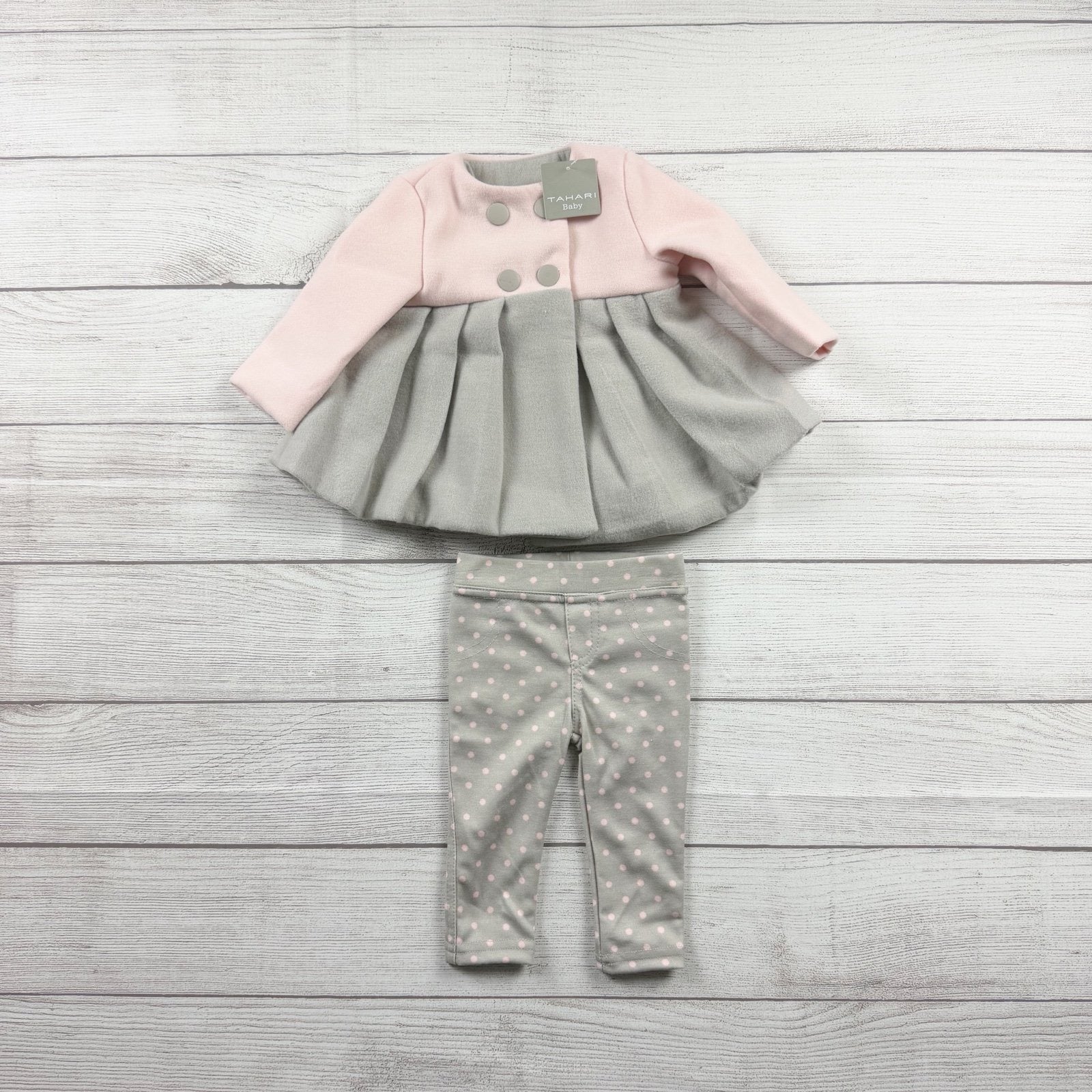 Two piece outfit. Grey gray and pink long sleeve buttoned pea coat. Grey gray jeggings leggings pants with polkadot print.