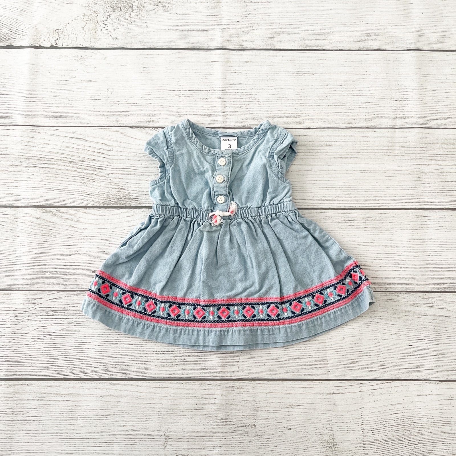Chambray blue short sleeve dress with buttons at chest. Embroidered design at bottom. Cotton