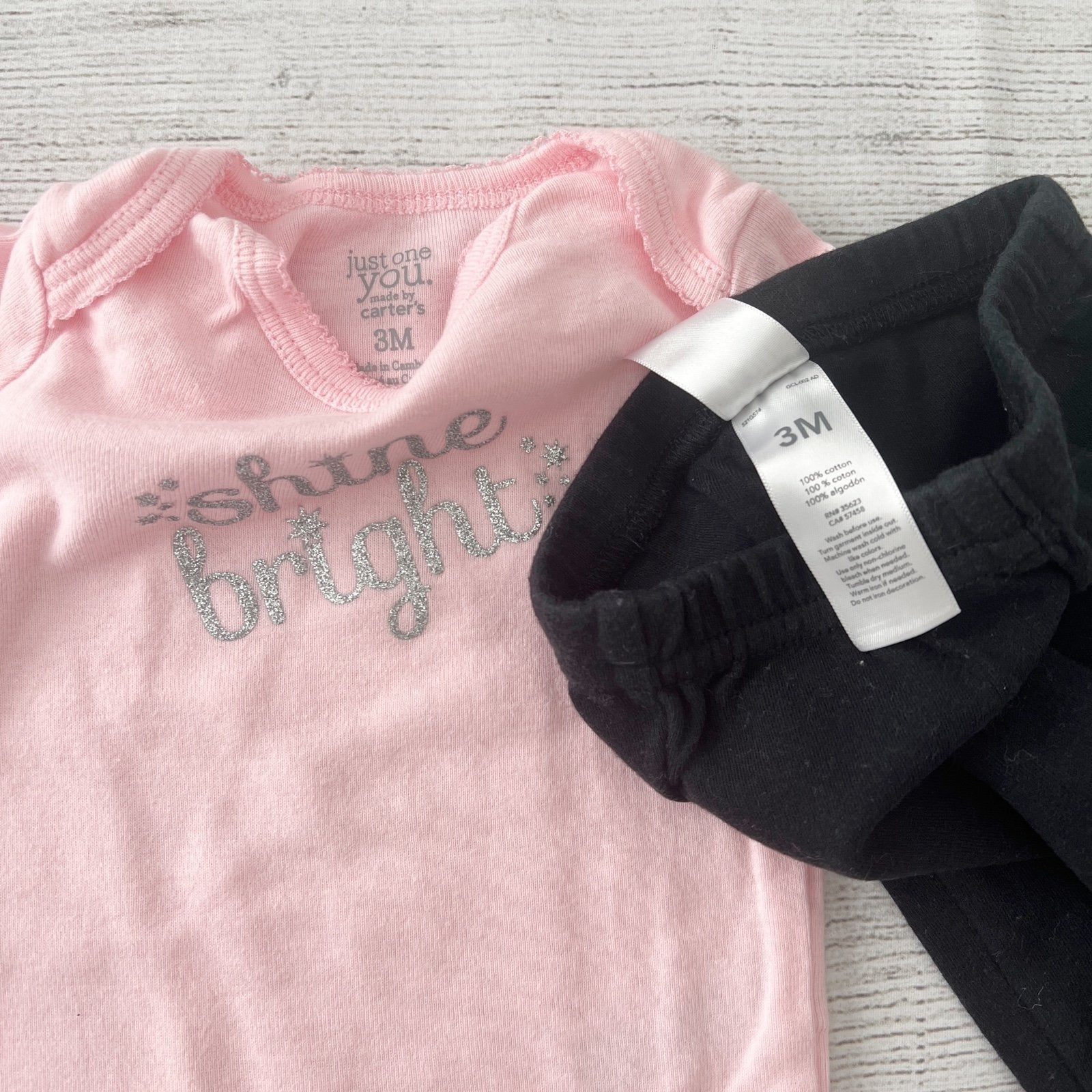 Two piece outfit. Pink long sleeve onesie with “shine bright” in metallic glitter silver. Black pants
