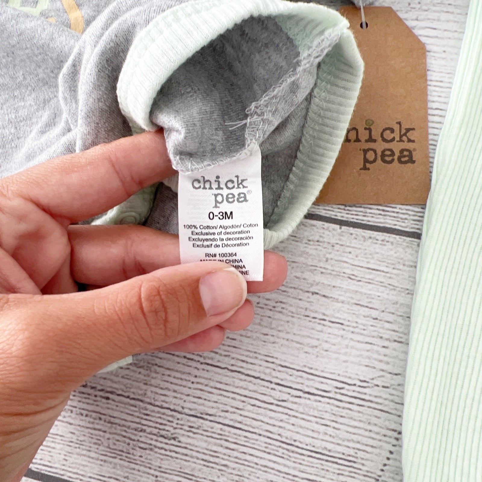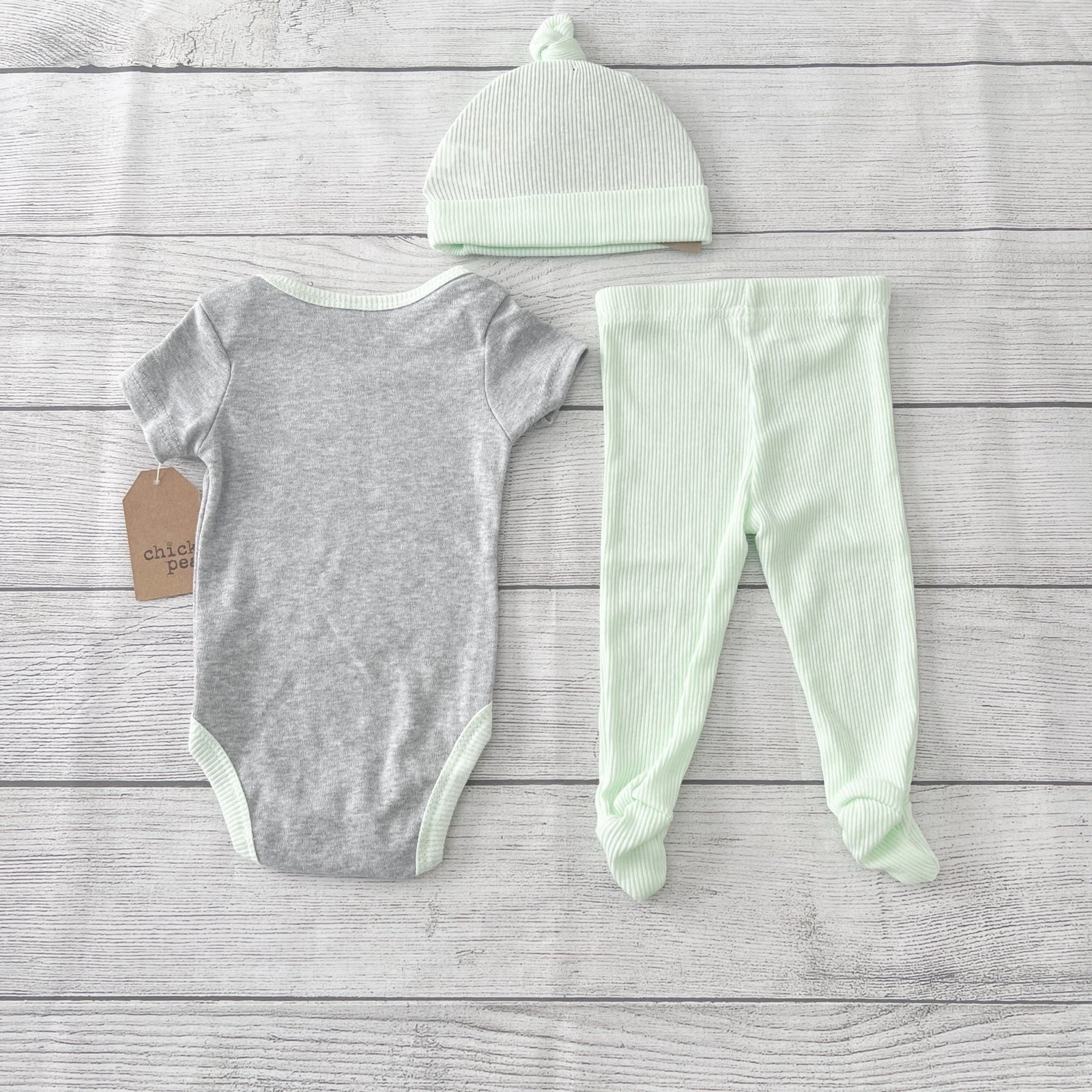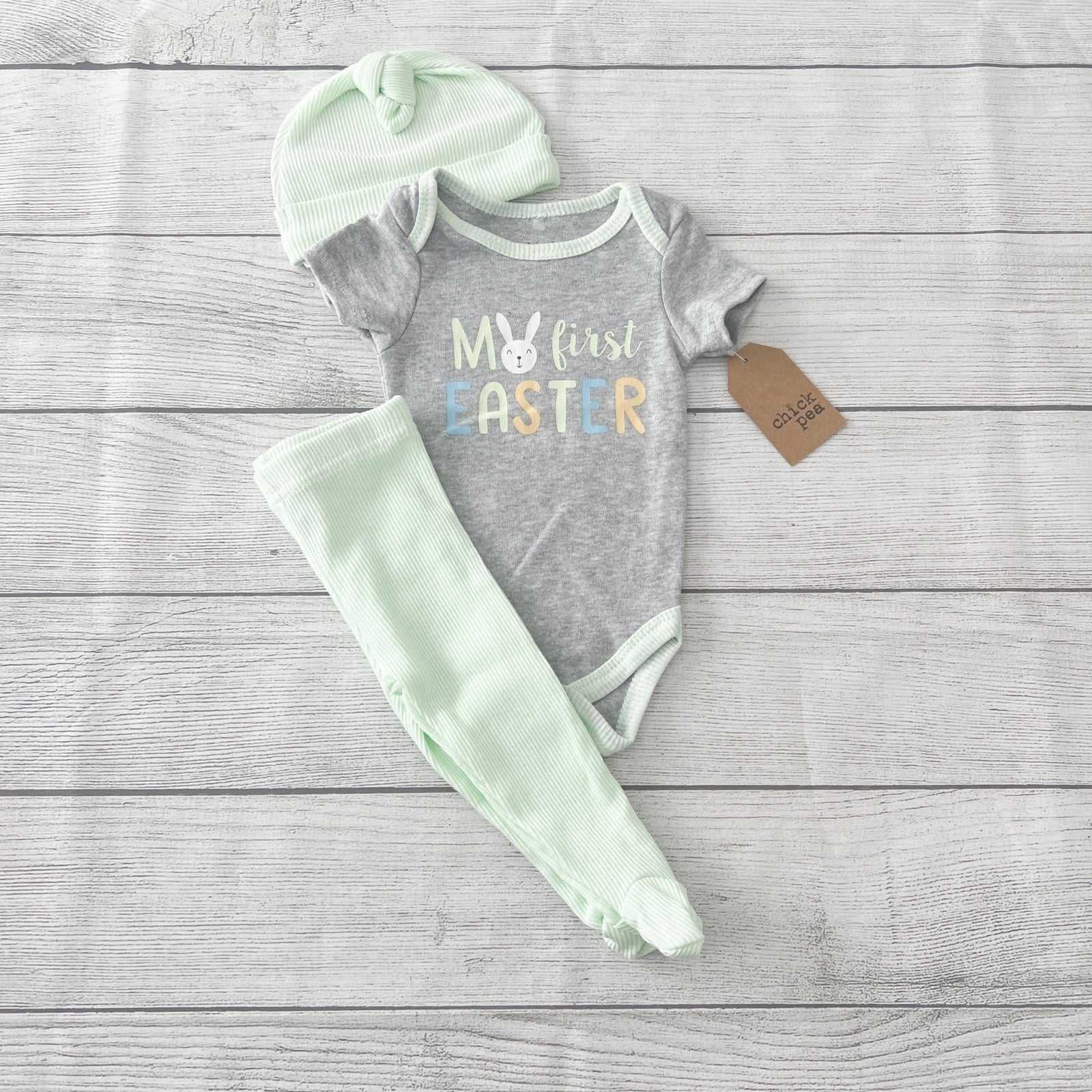 Three piece outfit bundle. Short sleeve grey gray onesie with “my first Easter” and bunny rabbit face on front. Mint green ribbed footed pants and matching knot hat. Cotton
