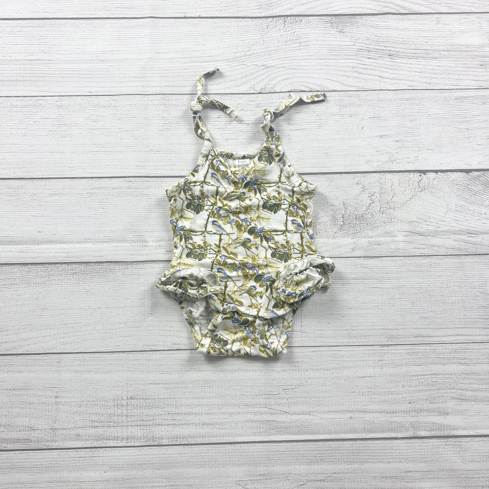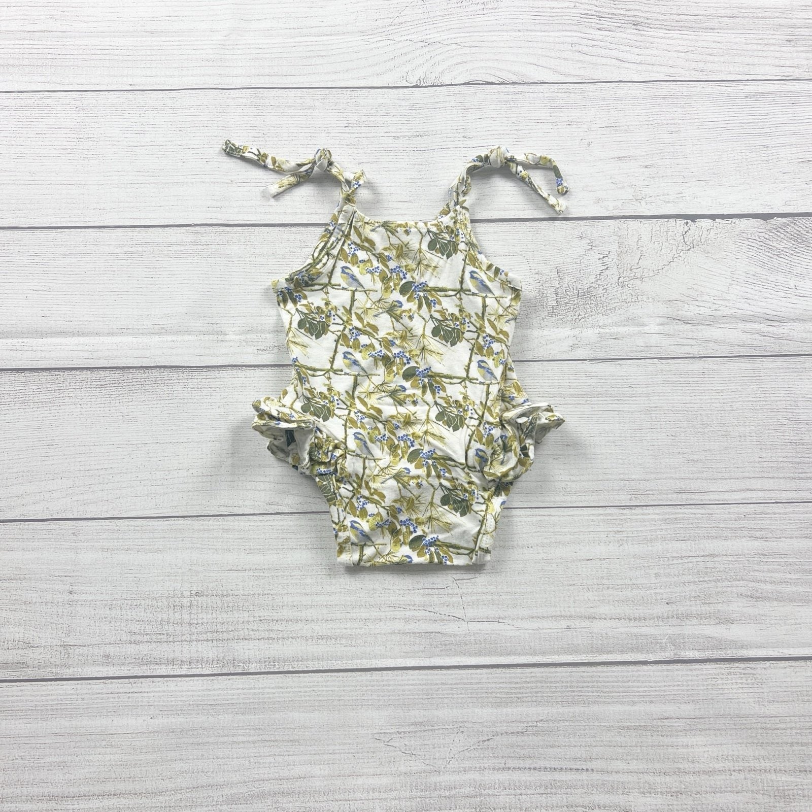 Sleeveless bodysuit with bird floral berry print. Ruffles at sides. Snaps at legs. Modal spandex blend