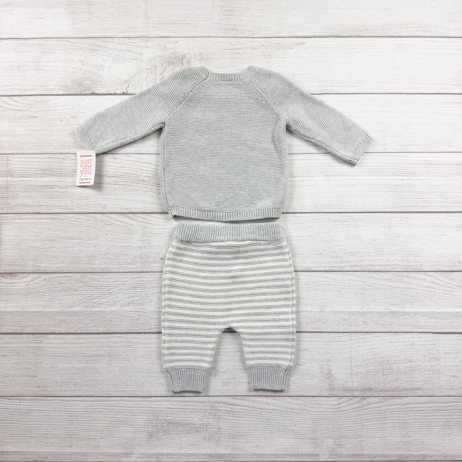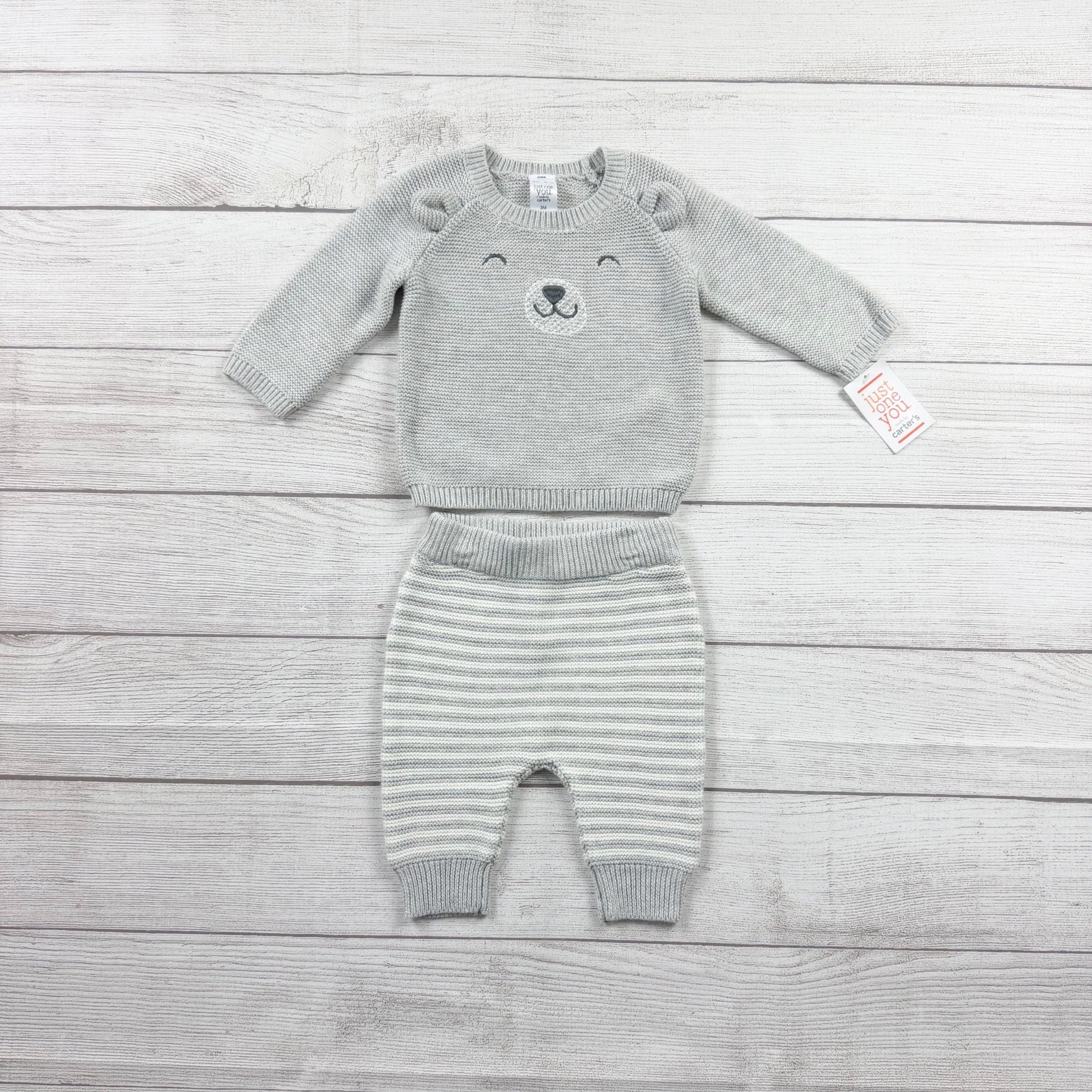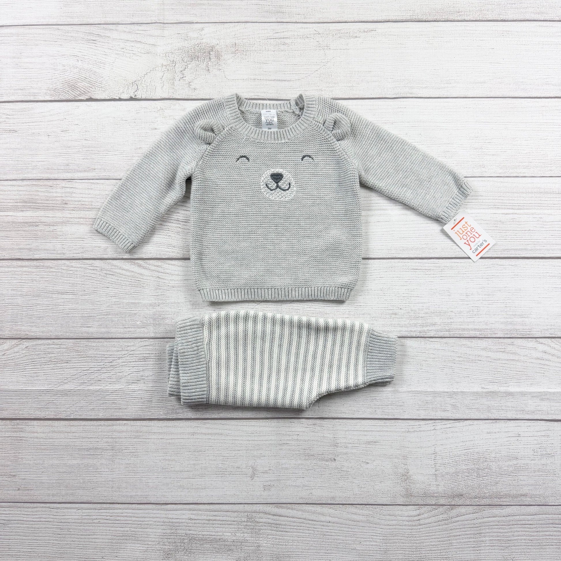 Grey gray long sleeve Crewneck sweater with bear face. Stripe joggers. Cotton acrylic blend