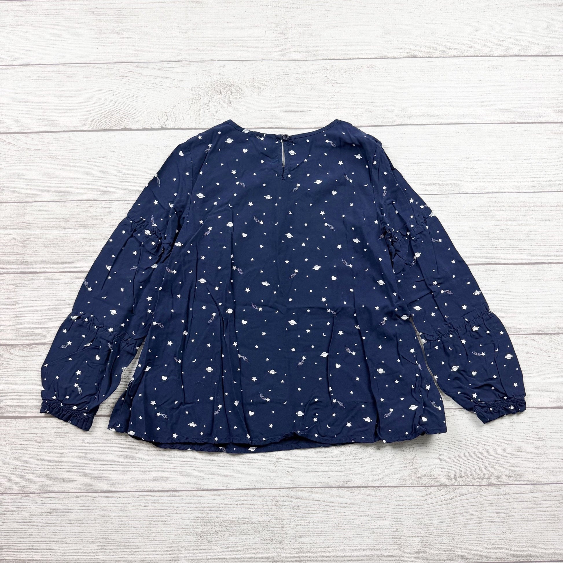 Blue long sleeve blouse shirt with outer space print including stars, planets, moon, etc. Viscose