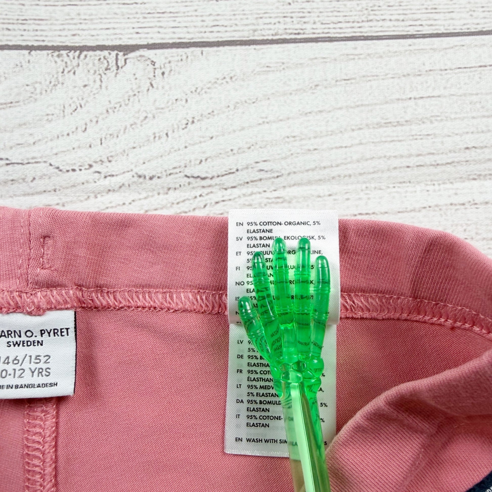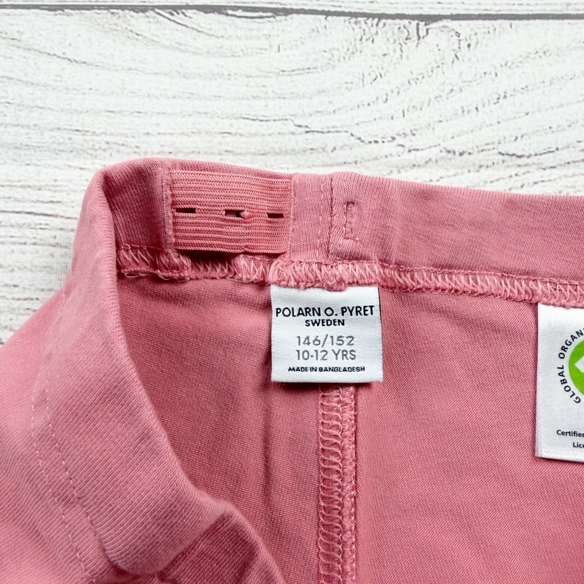 Solid pink leggings with adjustable waist. Cotton spandex blend
