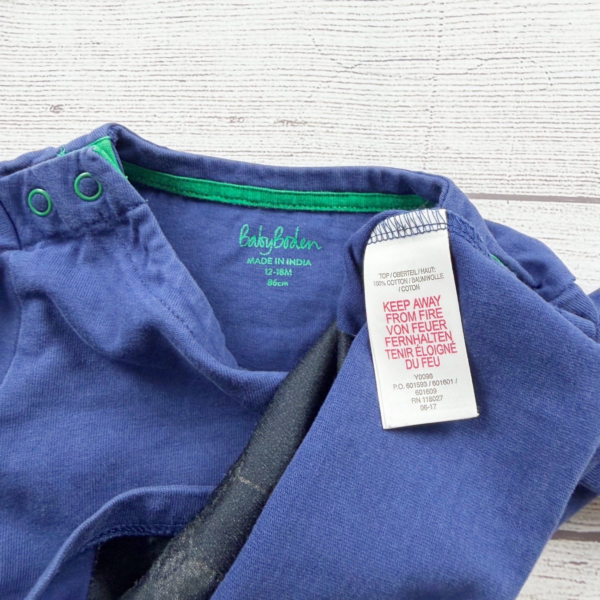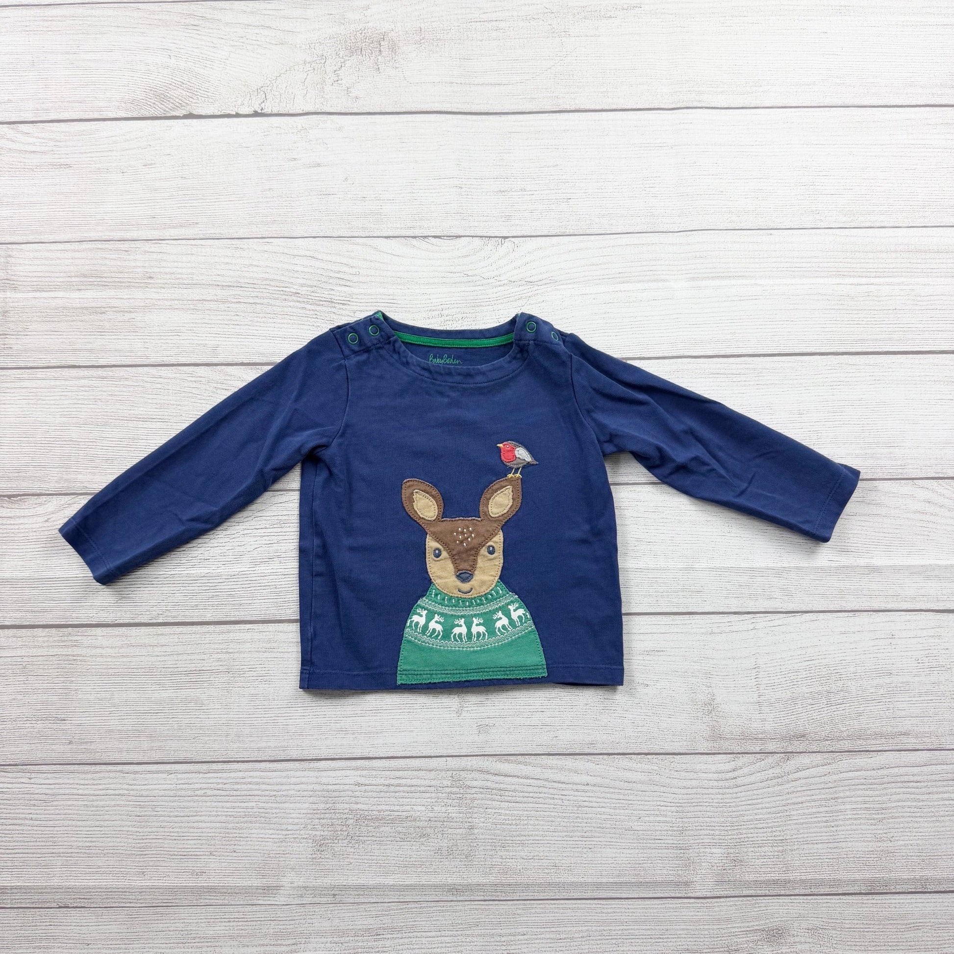 Blue long sleeve shirt with snaps at shoulder. Reindeer wearing holiday sweater appliqué. Cotton