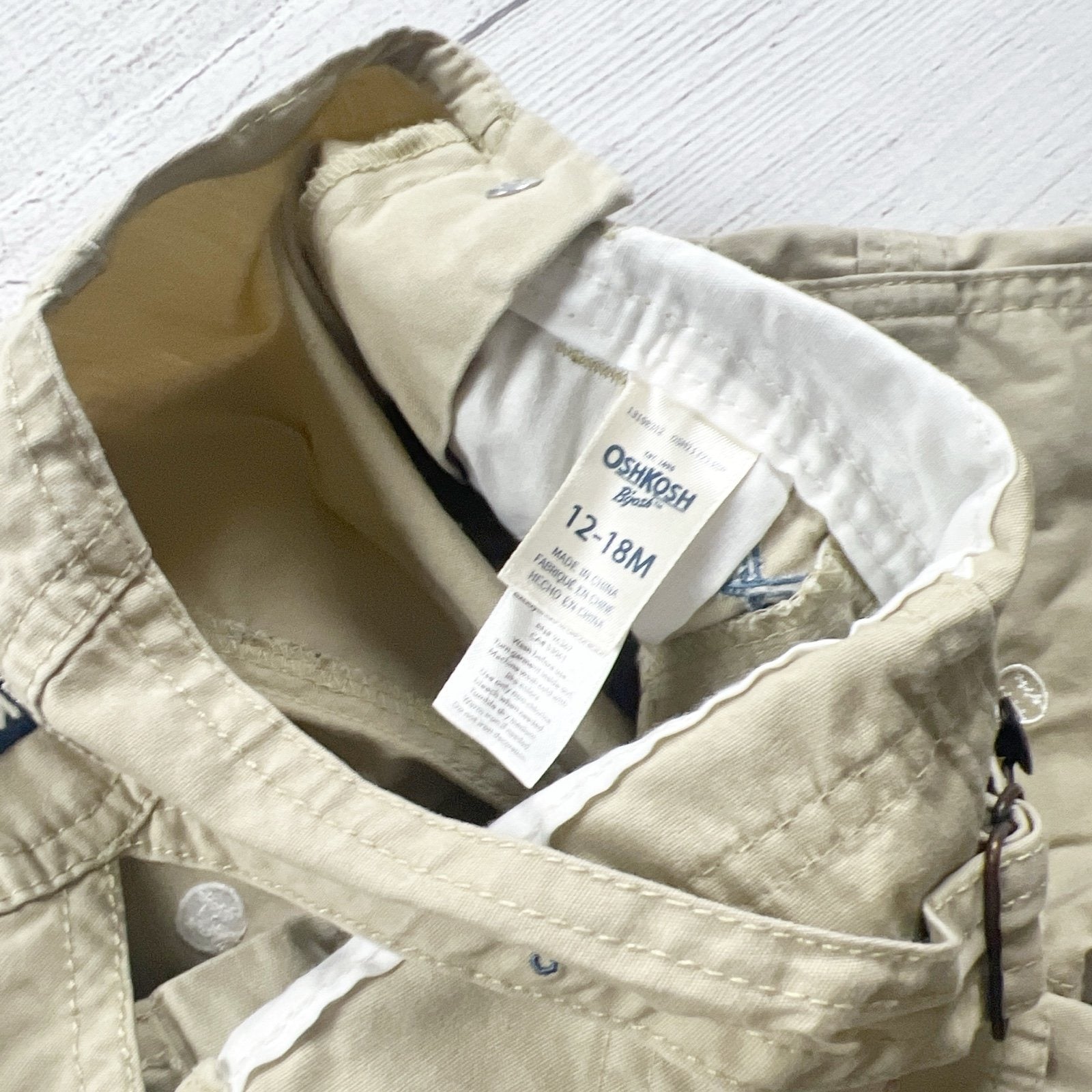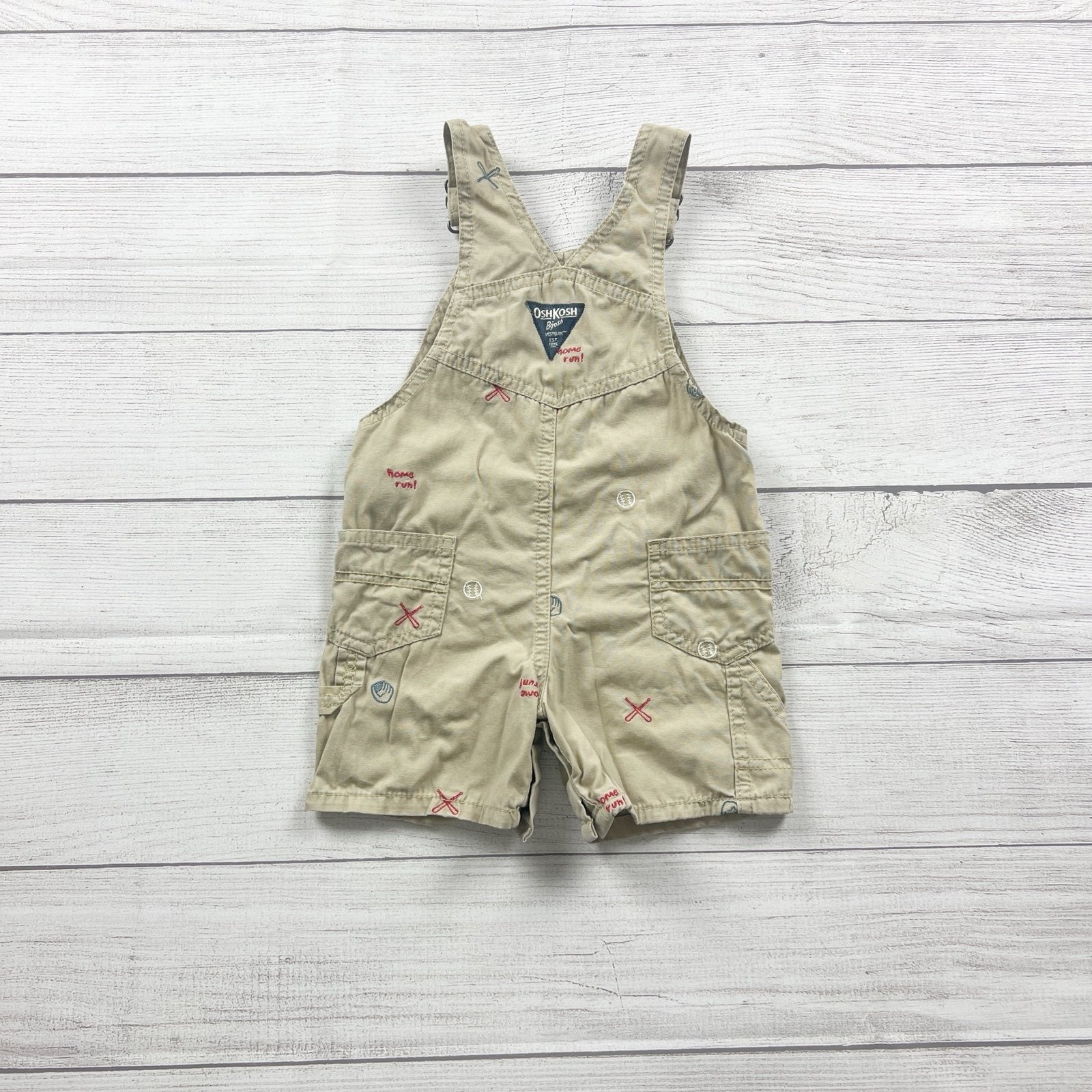 Khaki tank Shortalls overalls with snaps at legs. Embroidered baseball theme throughout.