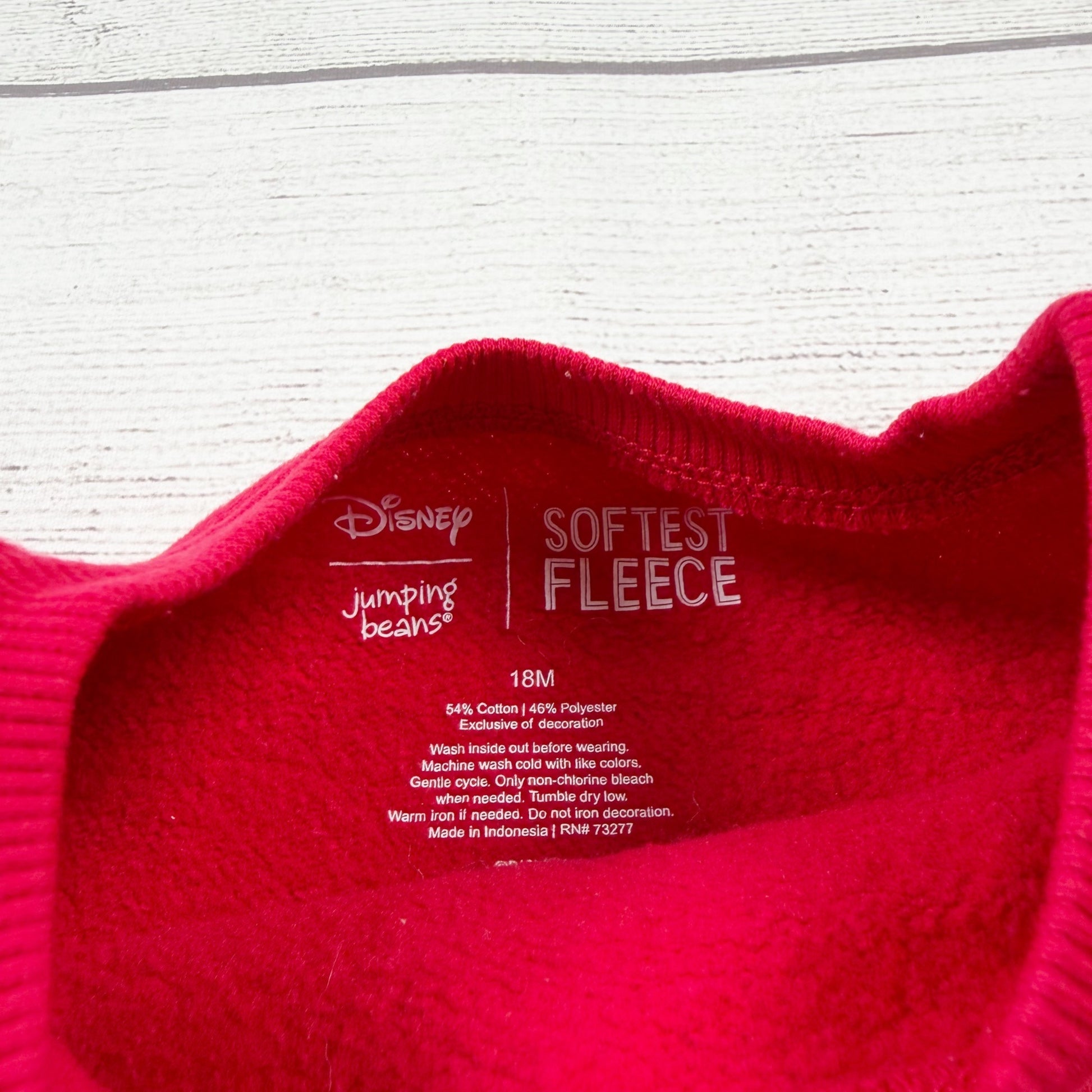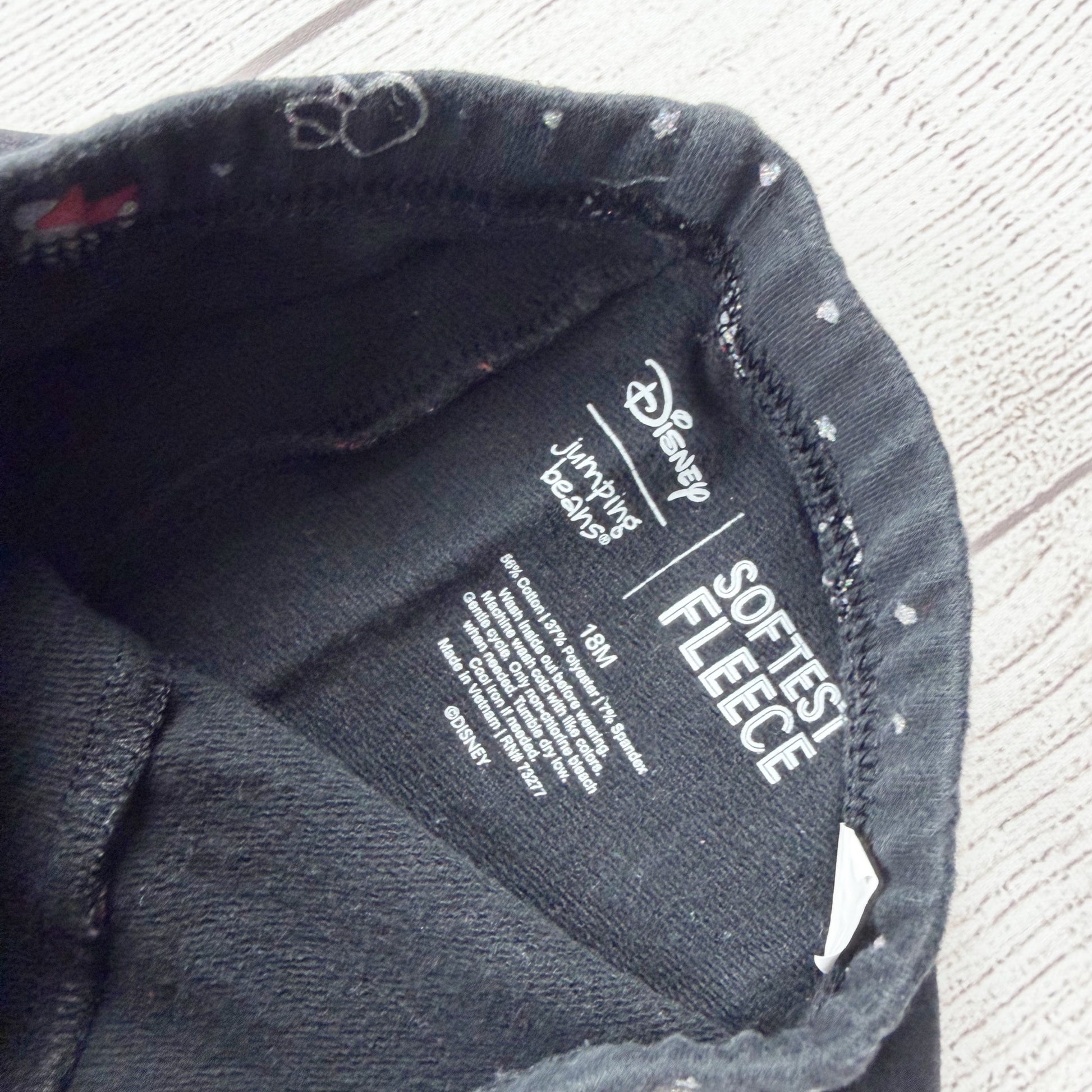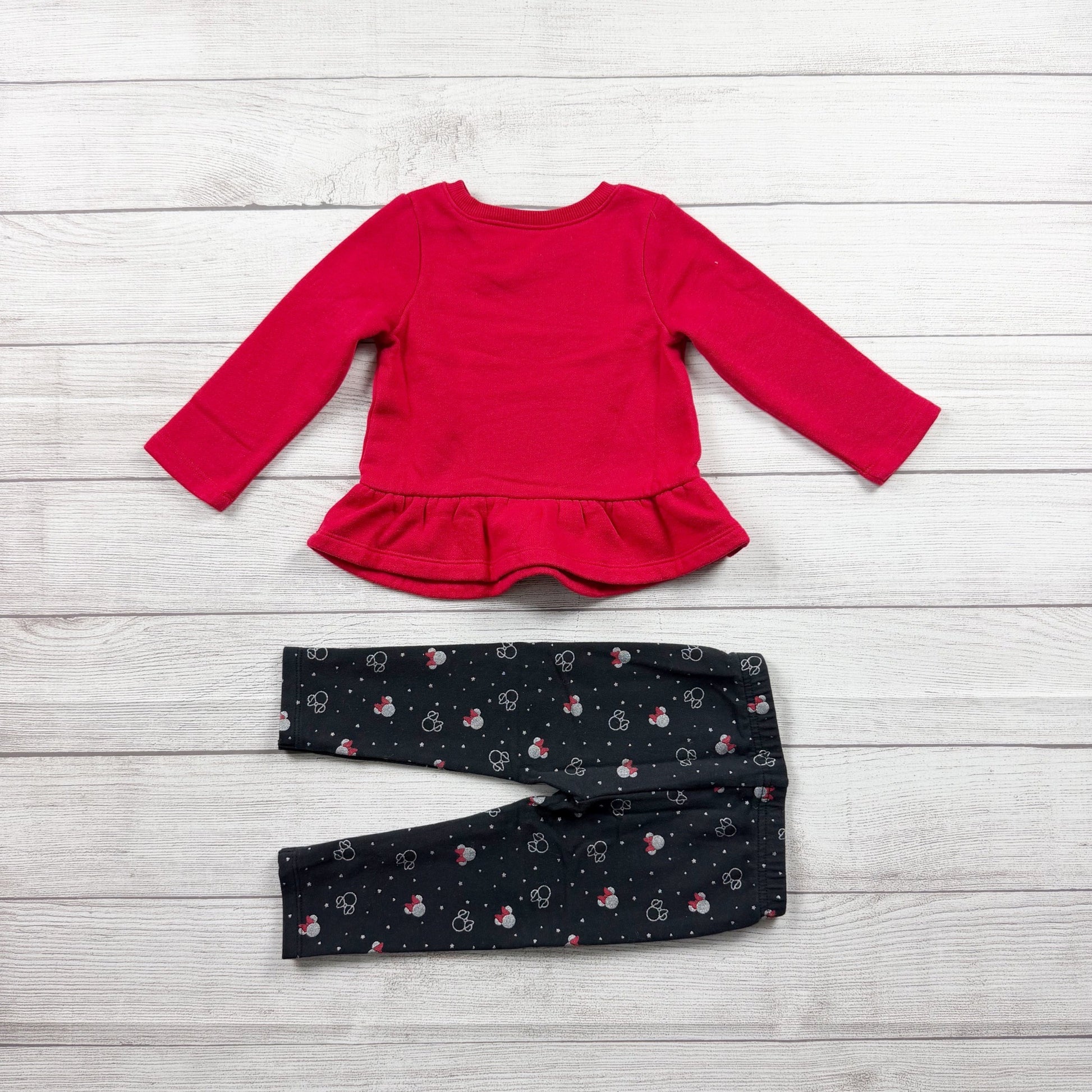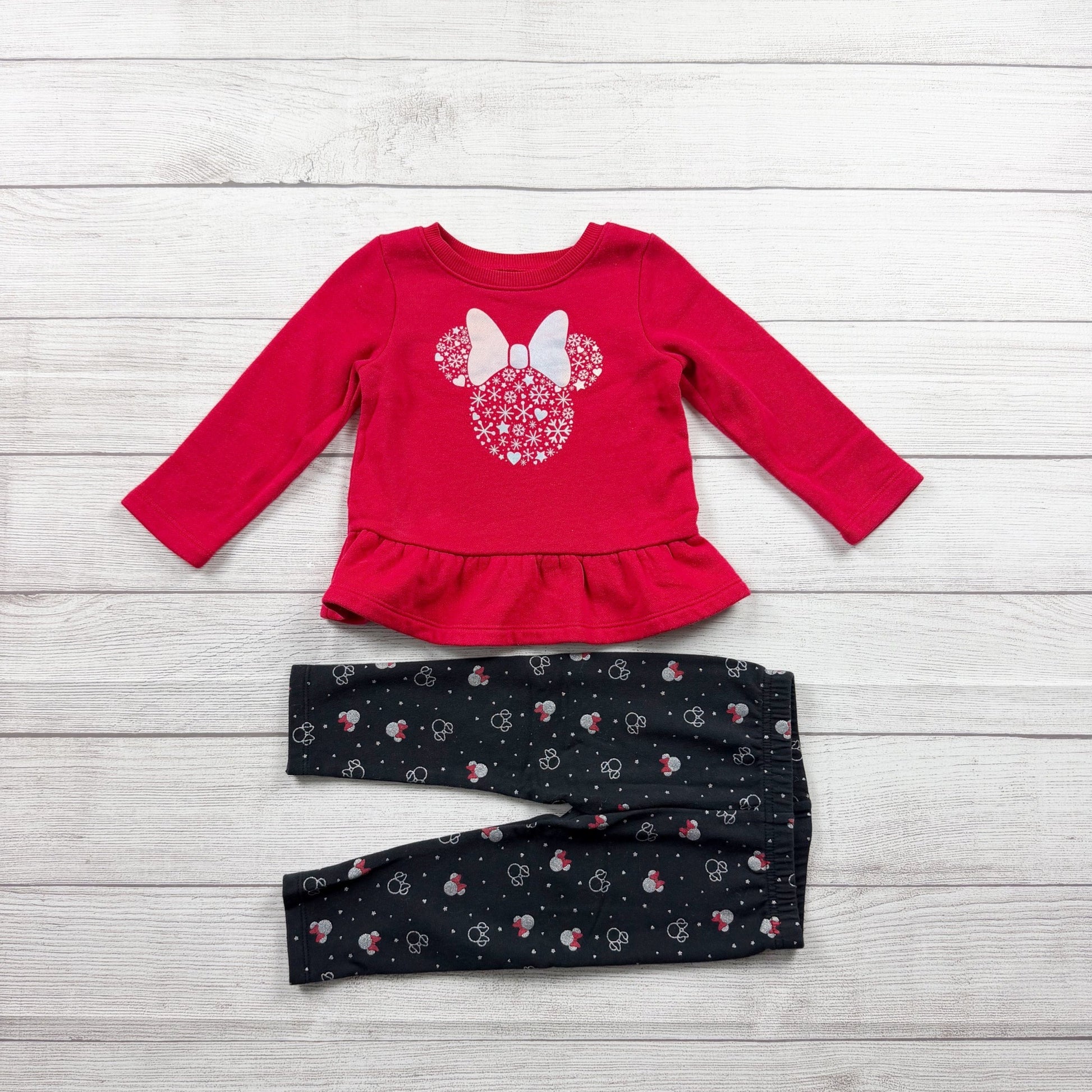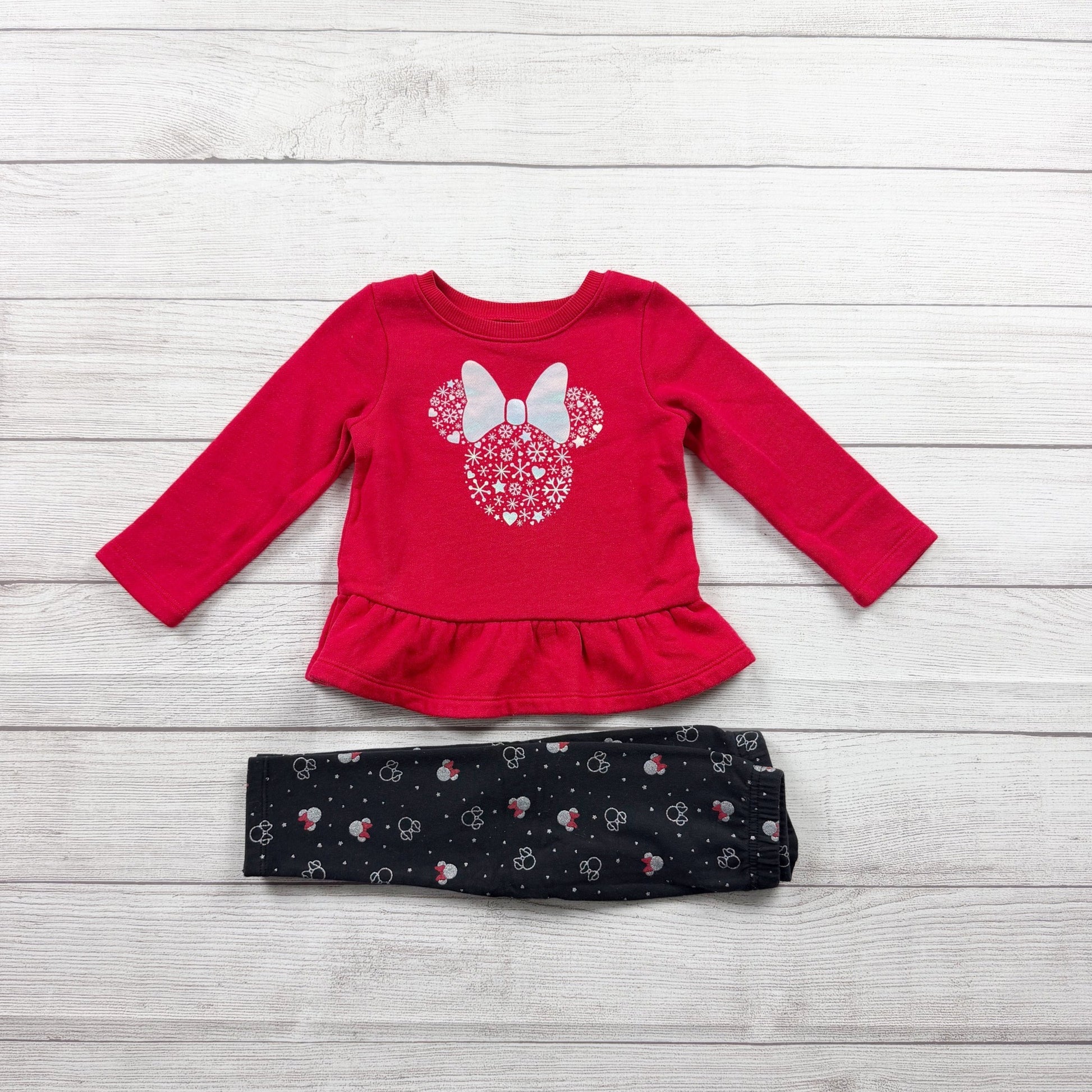 Red long sleeve fleece peplum Crewneck sweatshirt with Minnie Mouse ears graphic snowflakes. Black light fleece leggings with ear and snowflake print. Cotton polyester blend