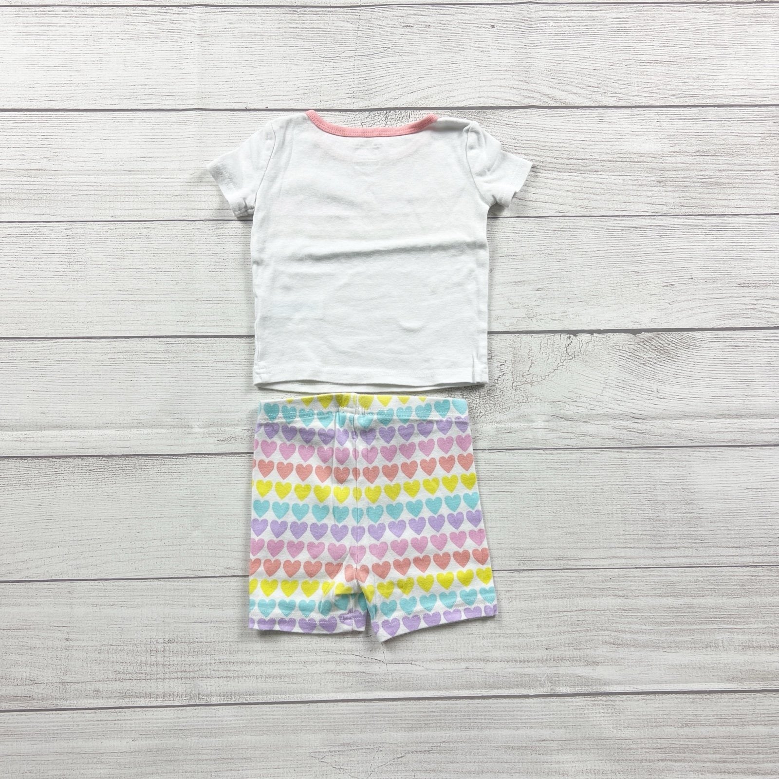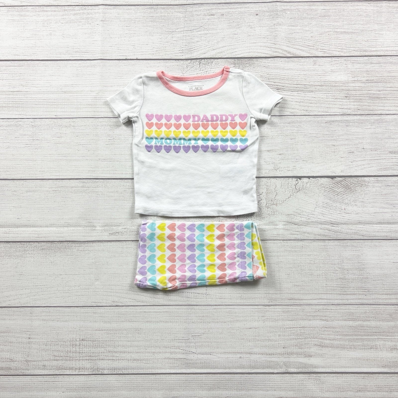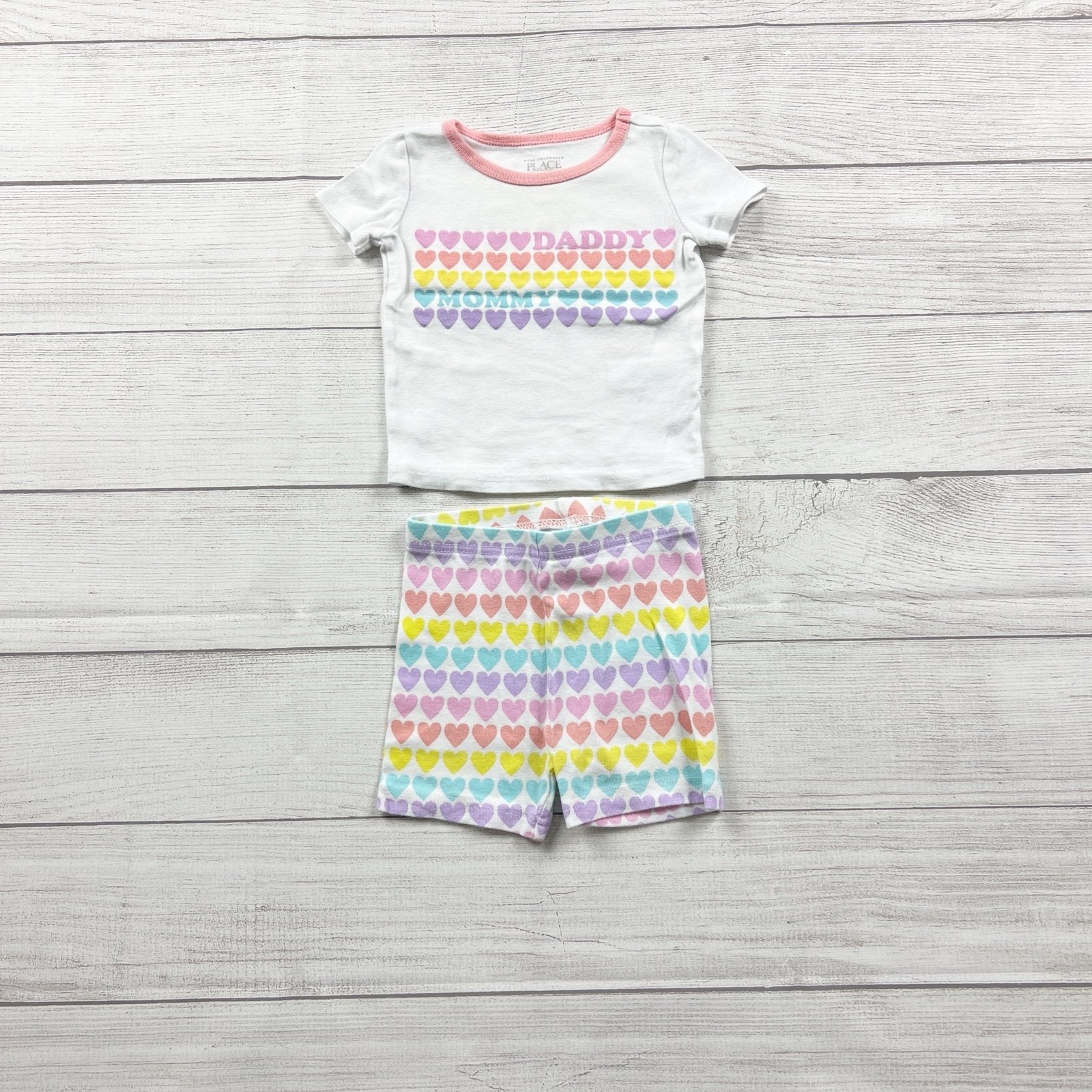 Two piece pajamas set. Short sleeve shirt and shorts with in white with colorful heart DADDY MOMMY graphic and print. Cotton