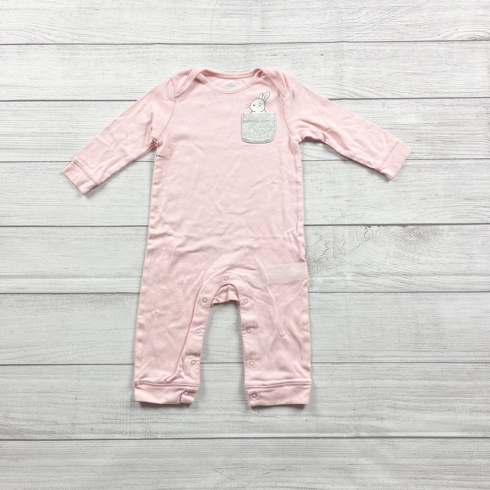 Pink one piece long sleeve romper with snaps at legs. Bunny rabbit at pocket. Easter. Cotton