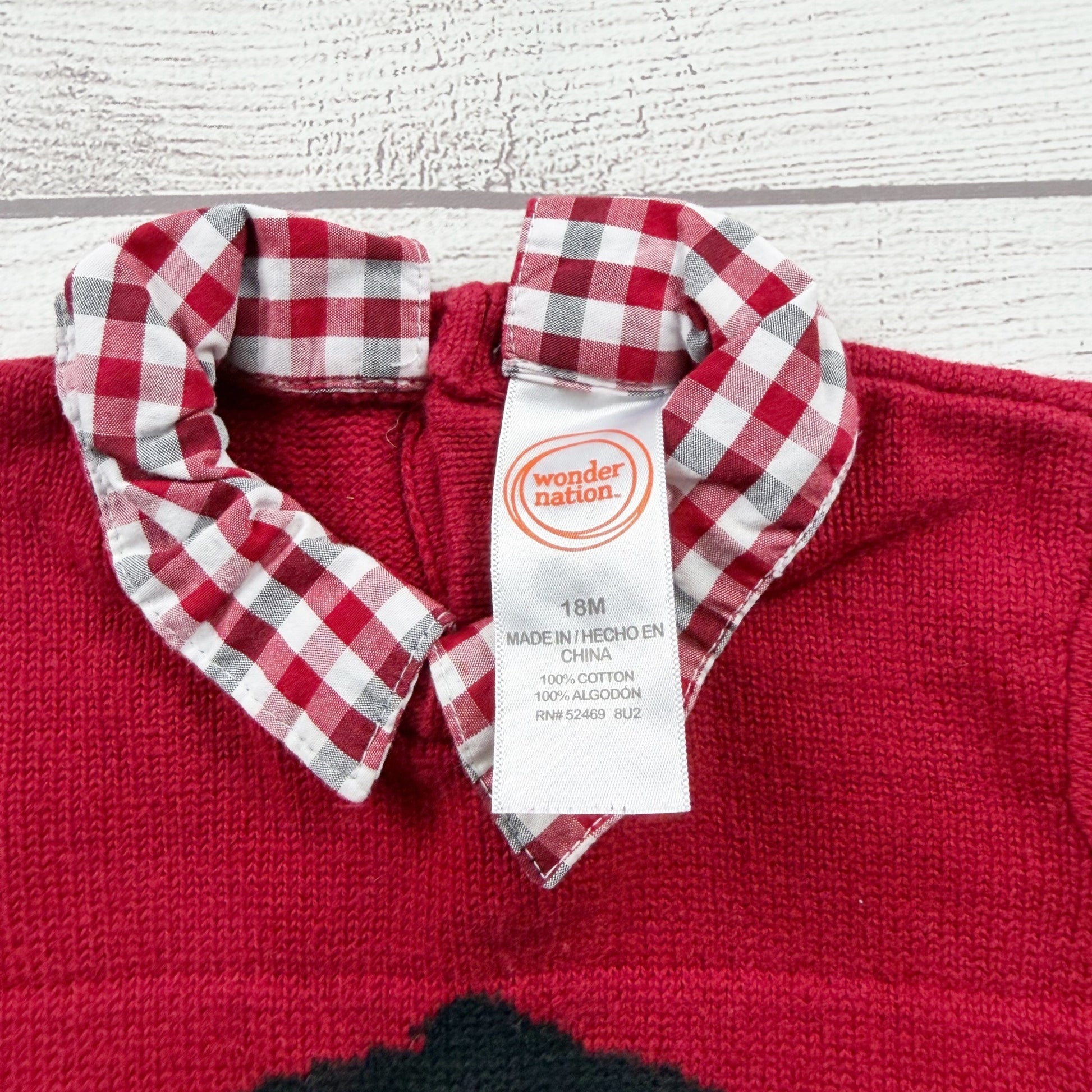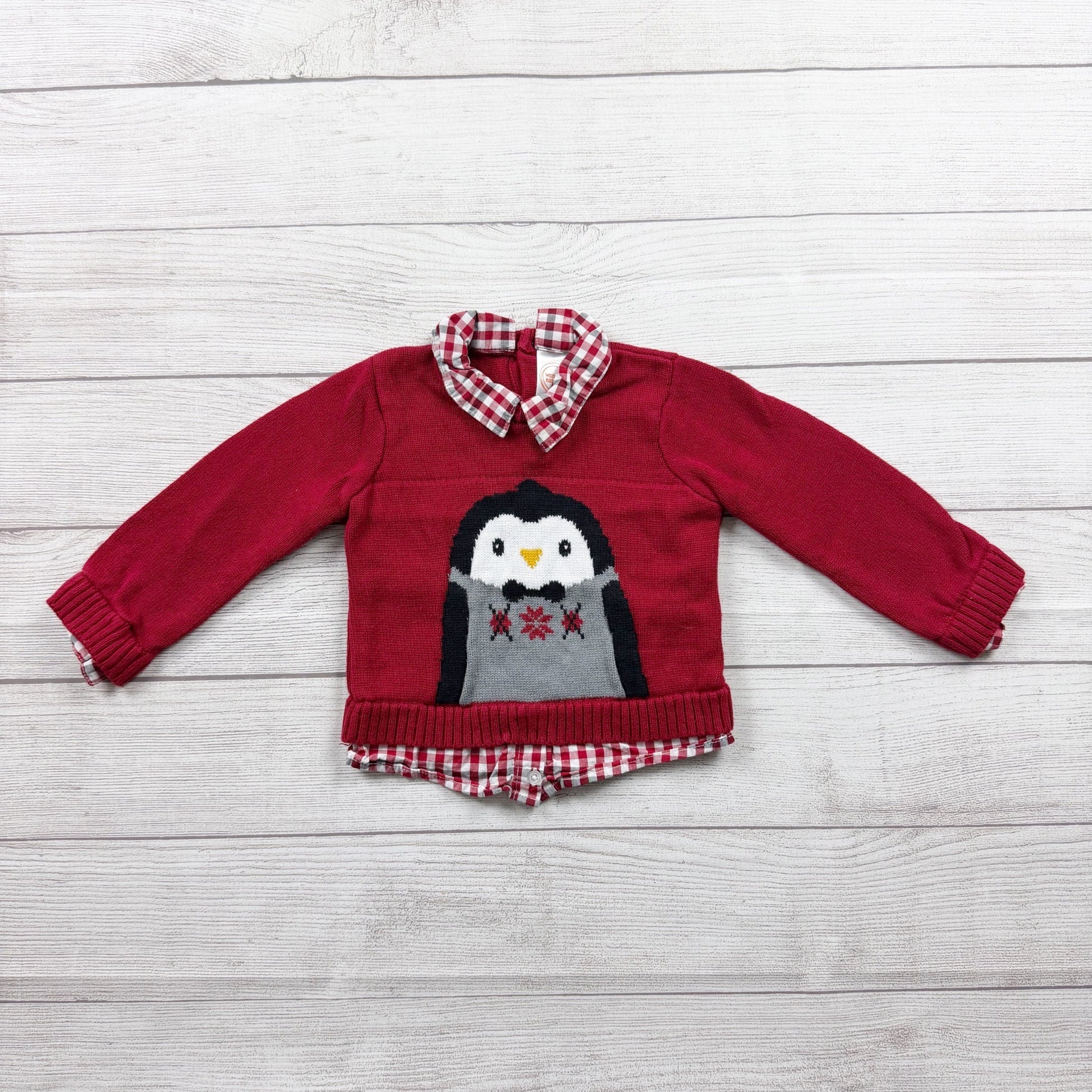 Red long sleeve sweater with holiday penguin on front. Red and white plaid collared undershirt layer intact. Buttons at back. Cotton