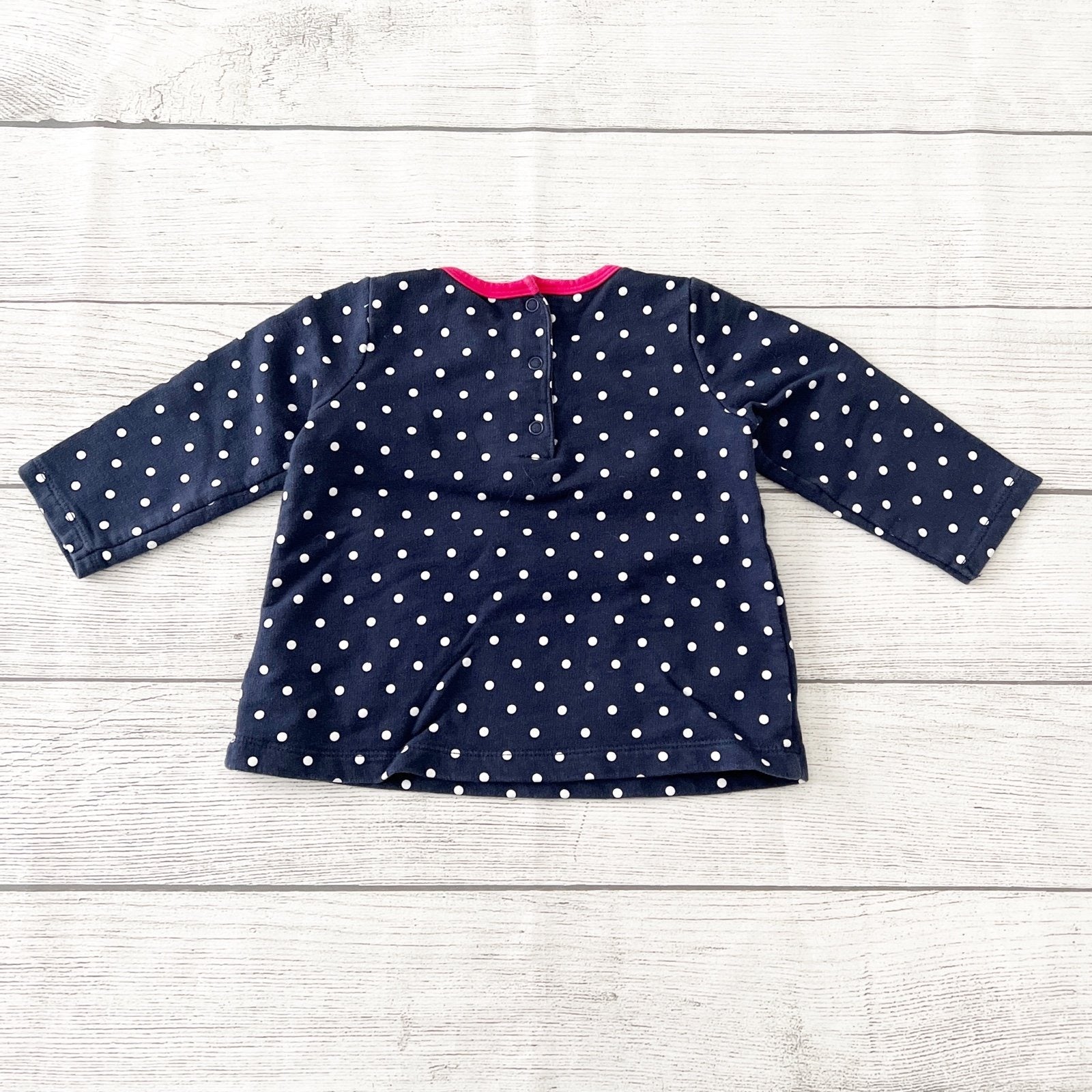 Blue long sleeve shirt with polkadot print. Pockets. Snaps at back. Cotton