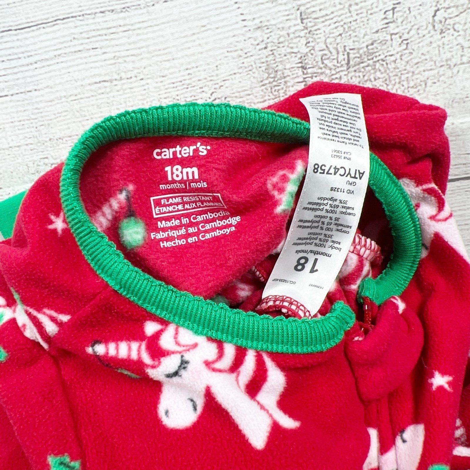 Red long sleeve zip up footed fleece sleep and play pajamas with holiday Christmas unicorn and stars print. Polyester