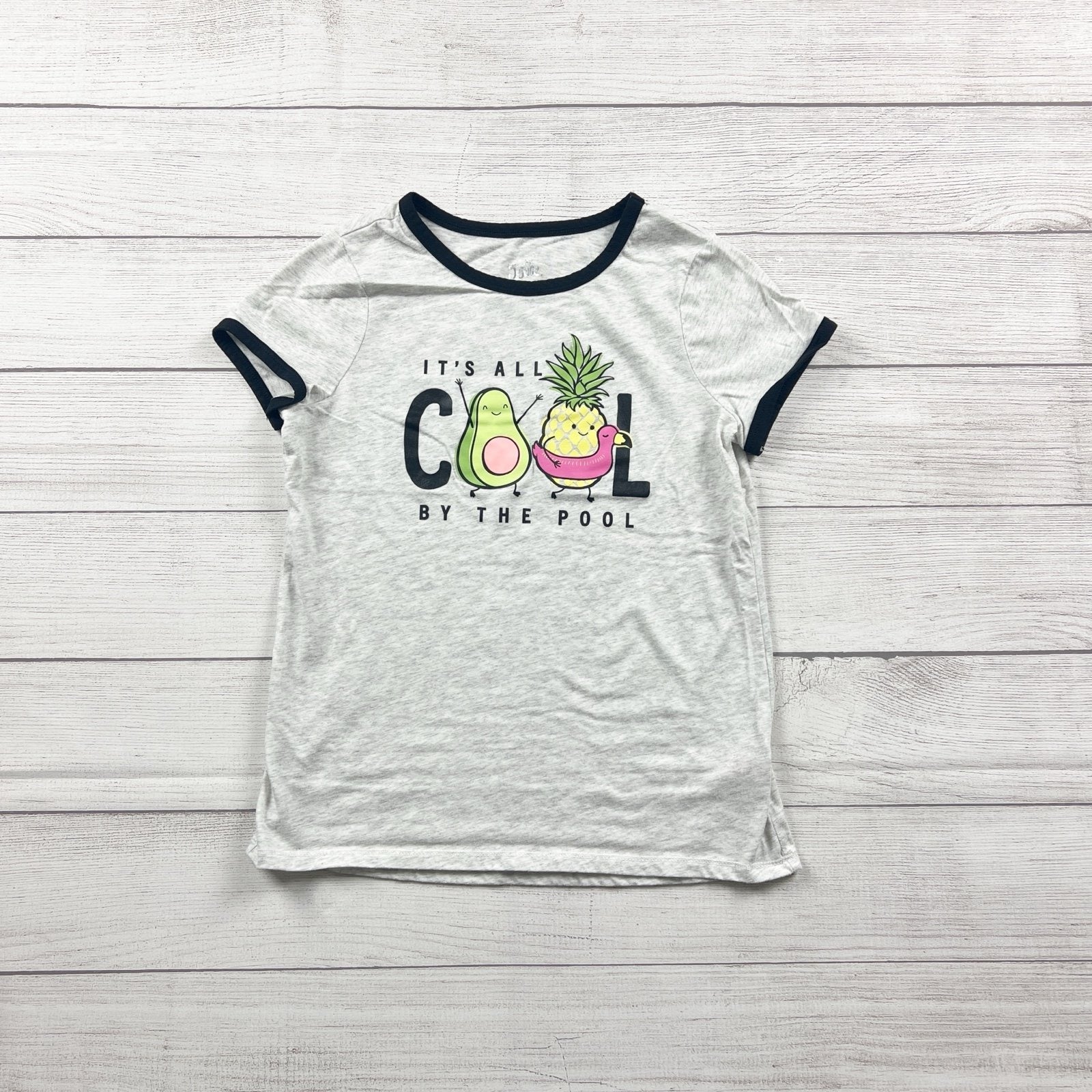 Grey gray and black ringer style short sleeve shirt with ITS ALL COOL BY THE POOL avocado pineapple graphic. Cotton polyester blend