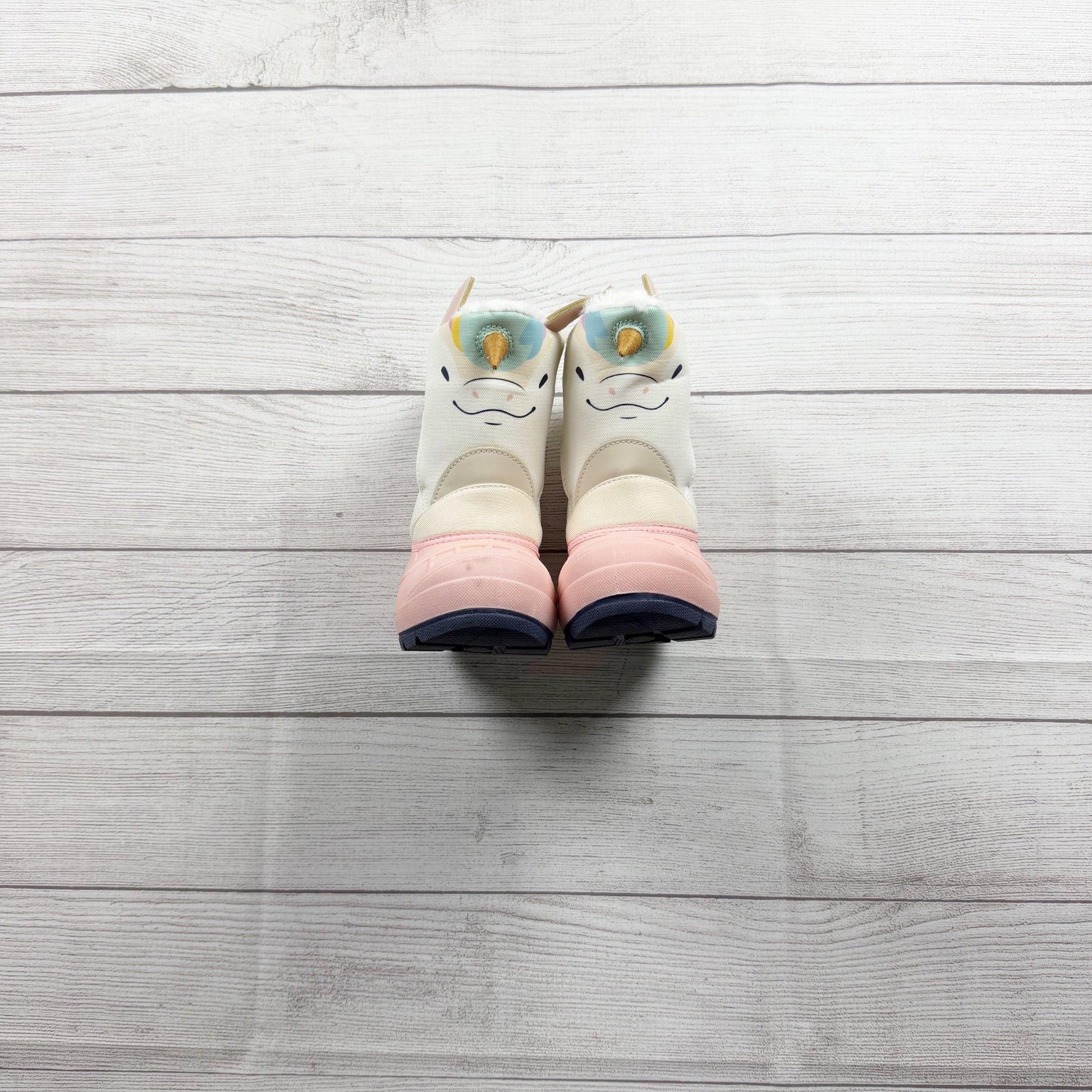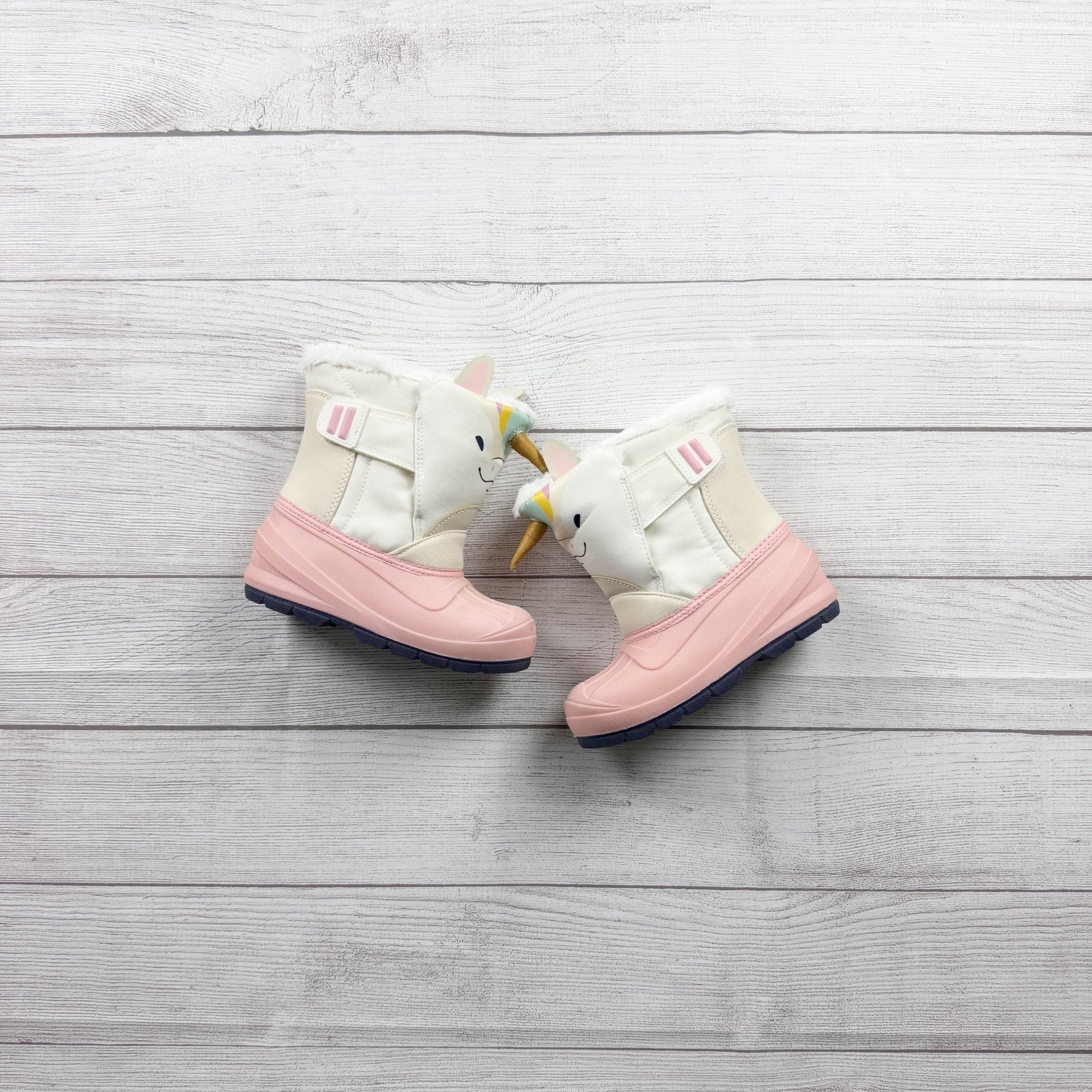 White and pink unicorn strap cozy thermolite snow boots.