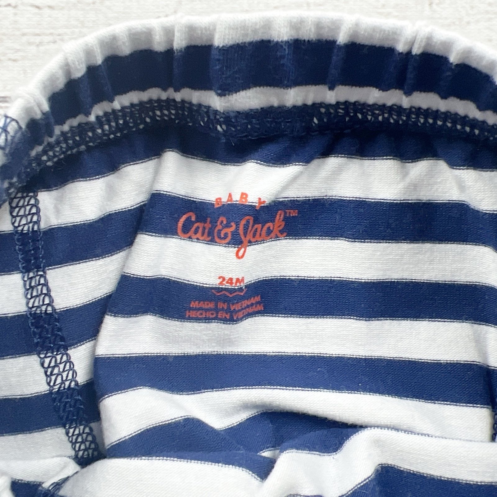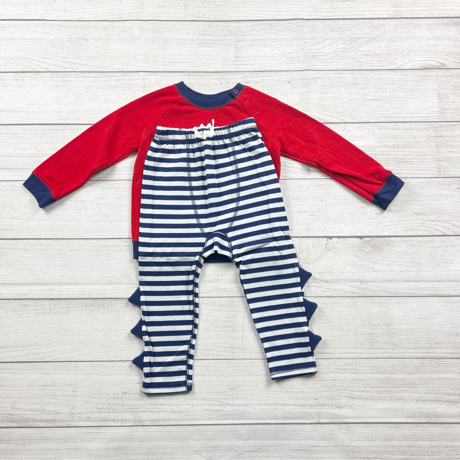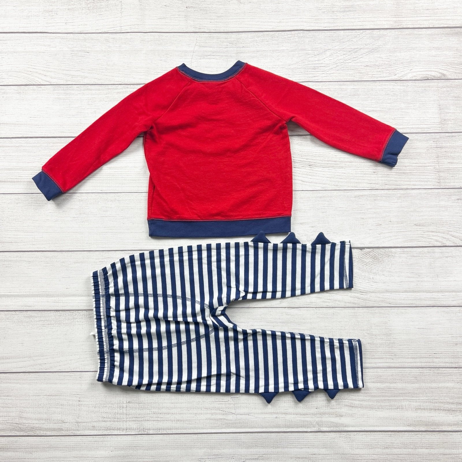 Two piece outfit. Red long sleeve shirt with “love a saurus” dinosaur and snaps at shoulder. Striped harem pants with Dino spikes