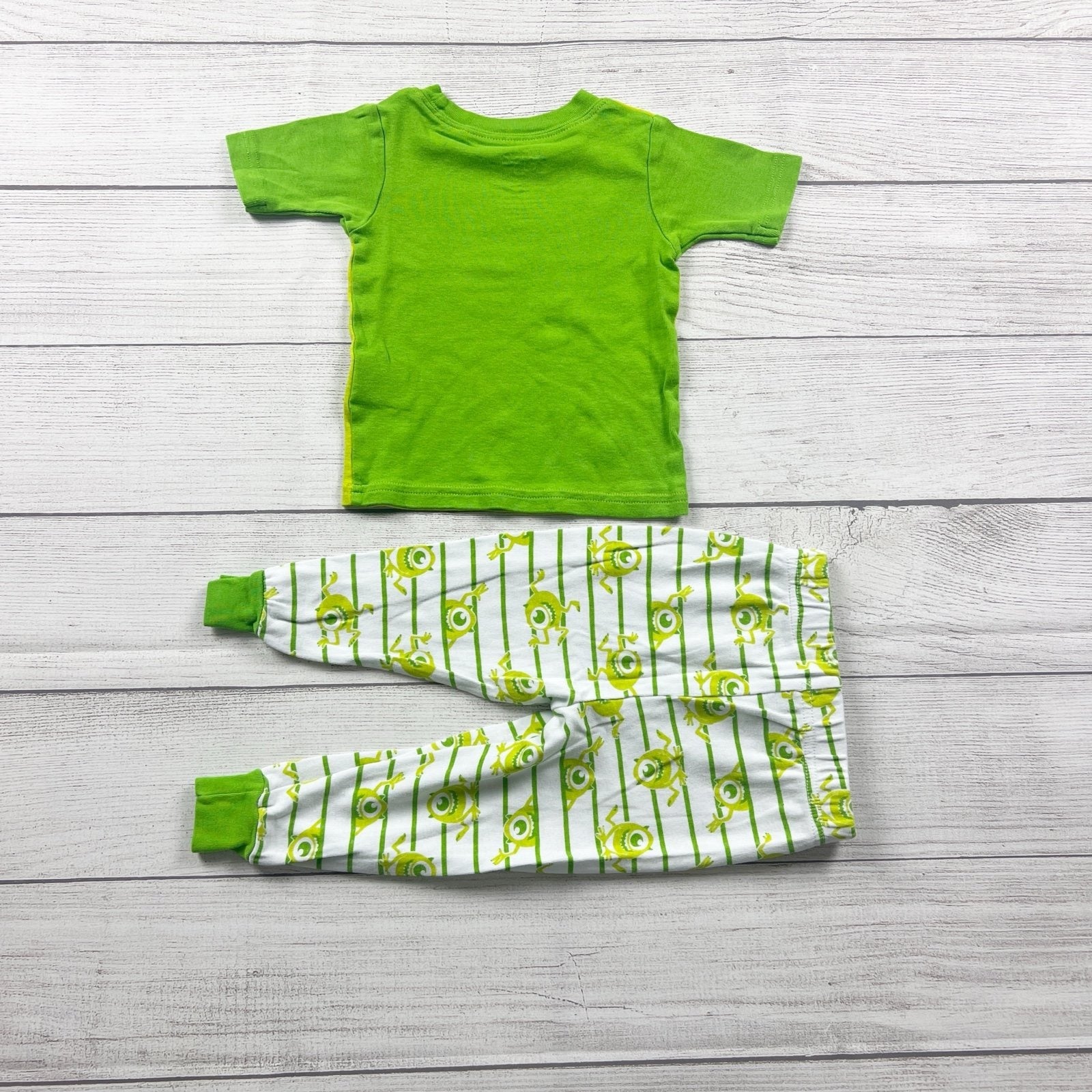 Two piece pajamas set. Green ringer short sleeve shirt with face LIL MONSTER and white green stripe pants with Mike Wazowski print. Cotton