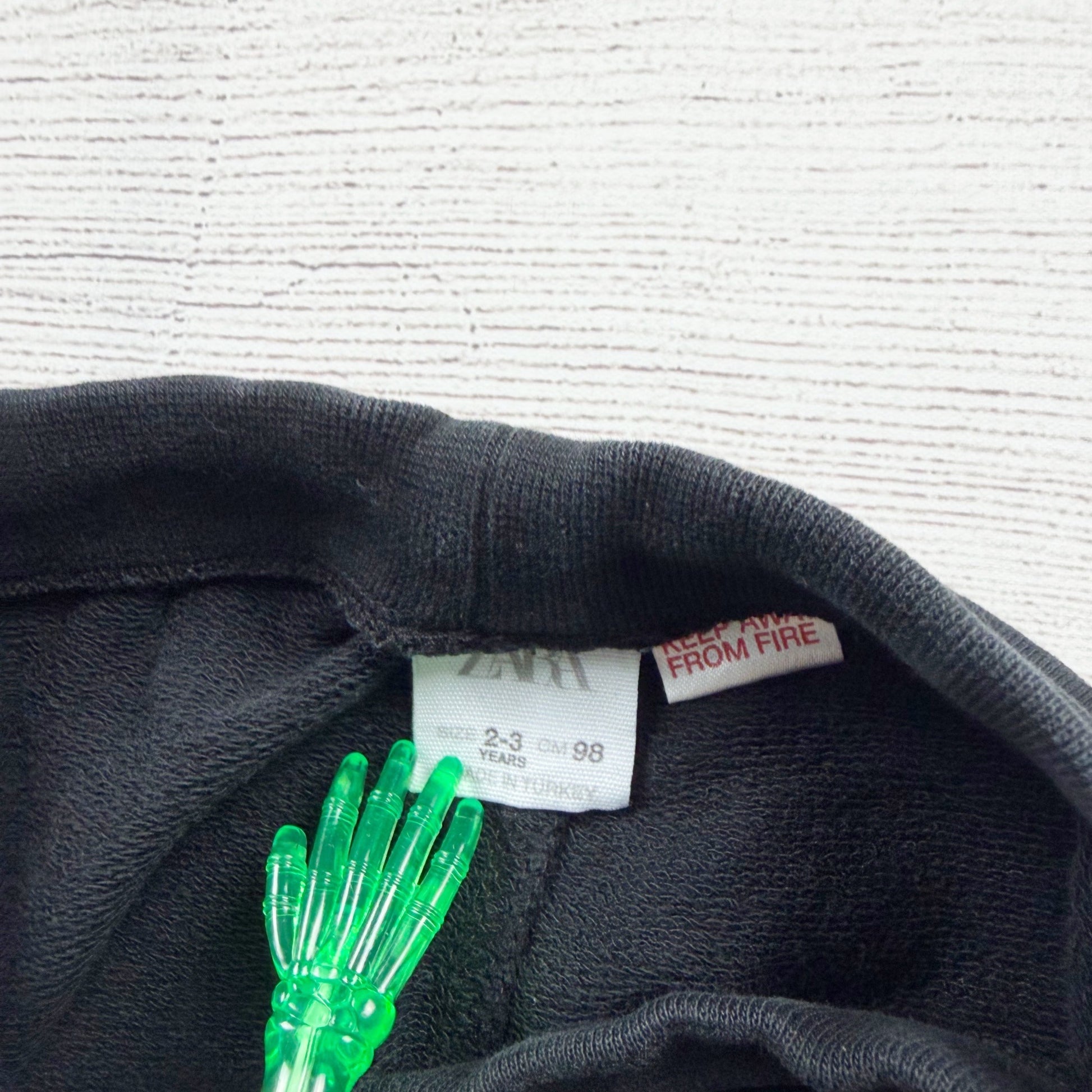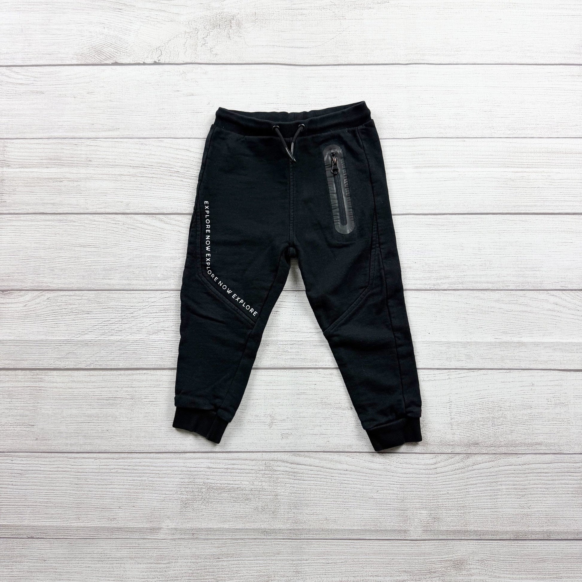 Zara2 3Black jogger pants with “explore now” graphic.