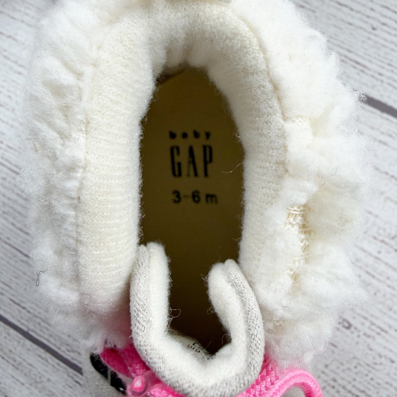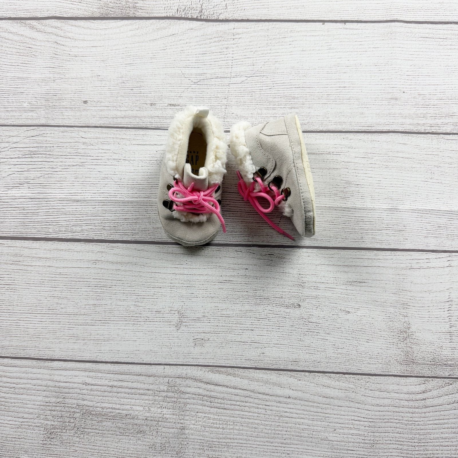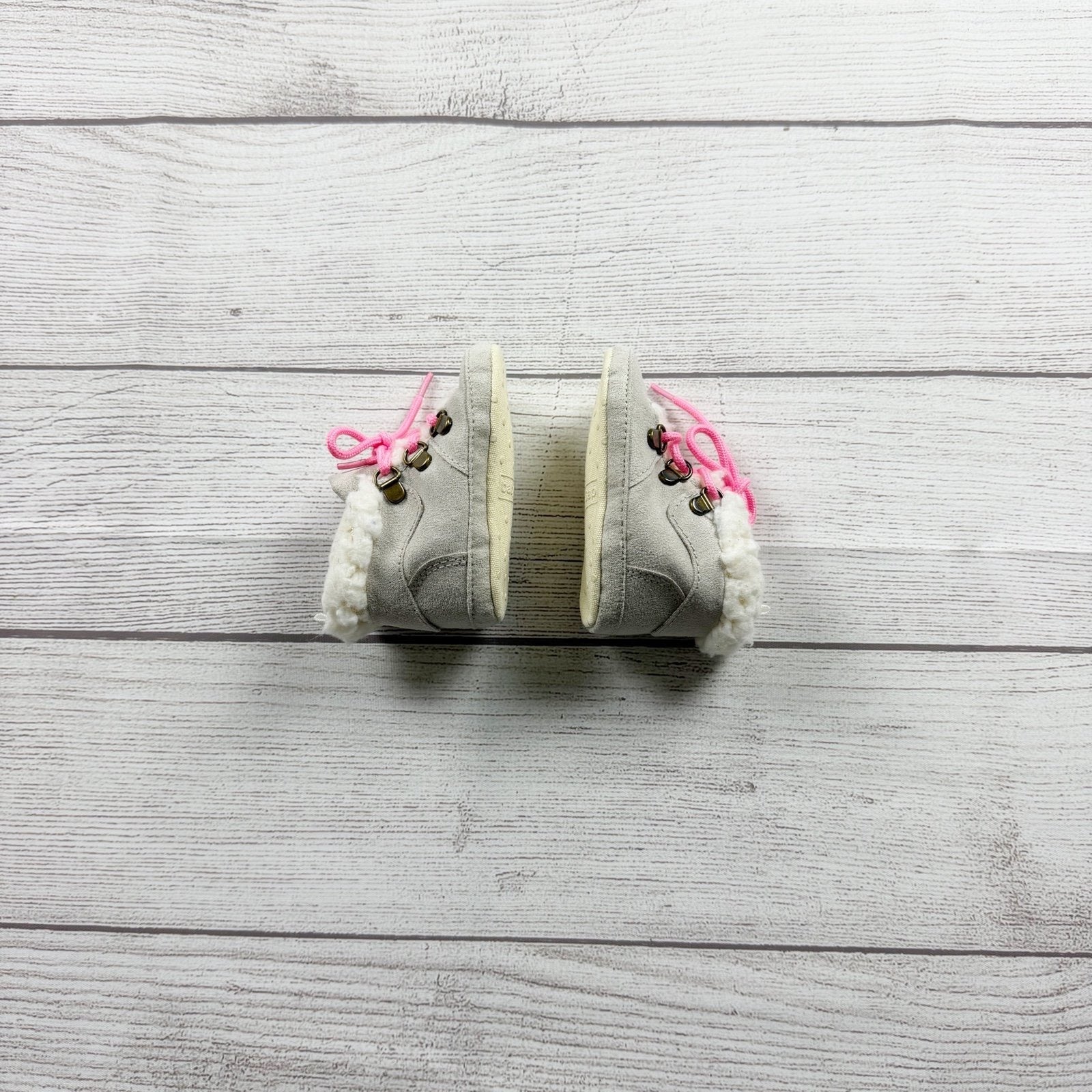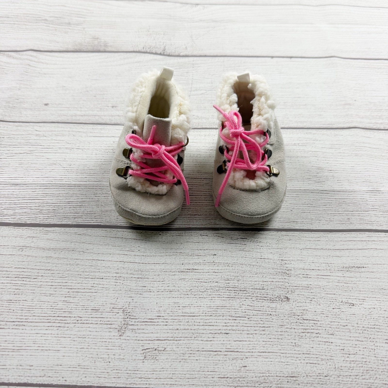Beige slip on soft soles crib shoes booties boots with faux fur trim. Pink laces.