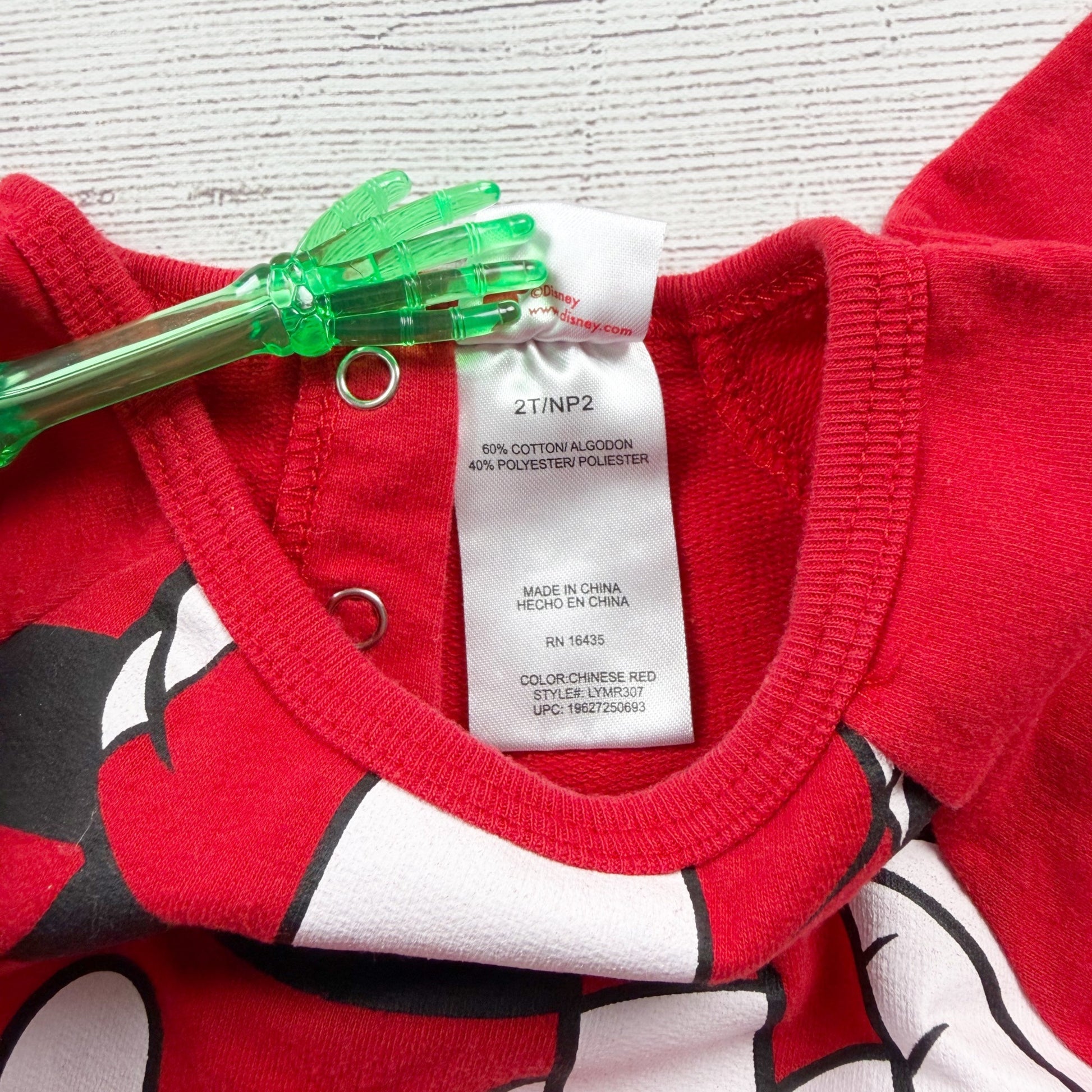 Red long sleeve and pants romper with Mickey character holiday graphic. Snaps at legs and back. Cotton polyester blend