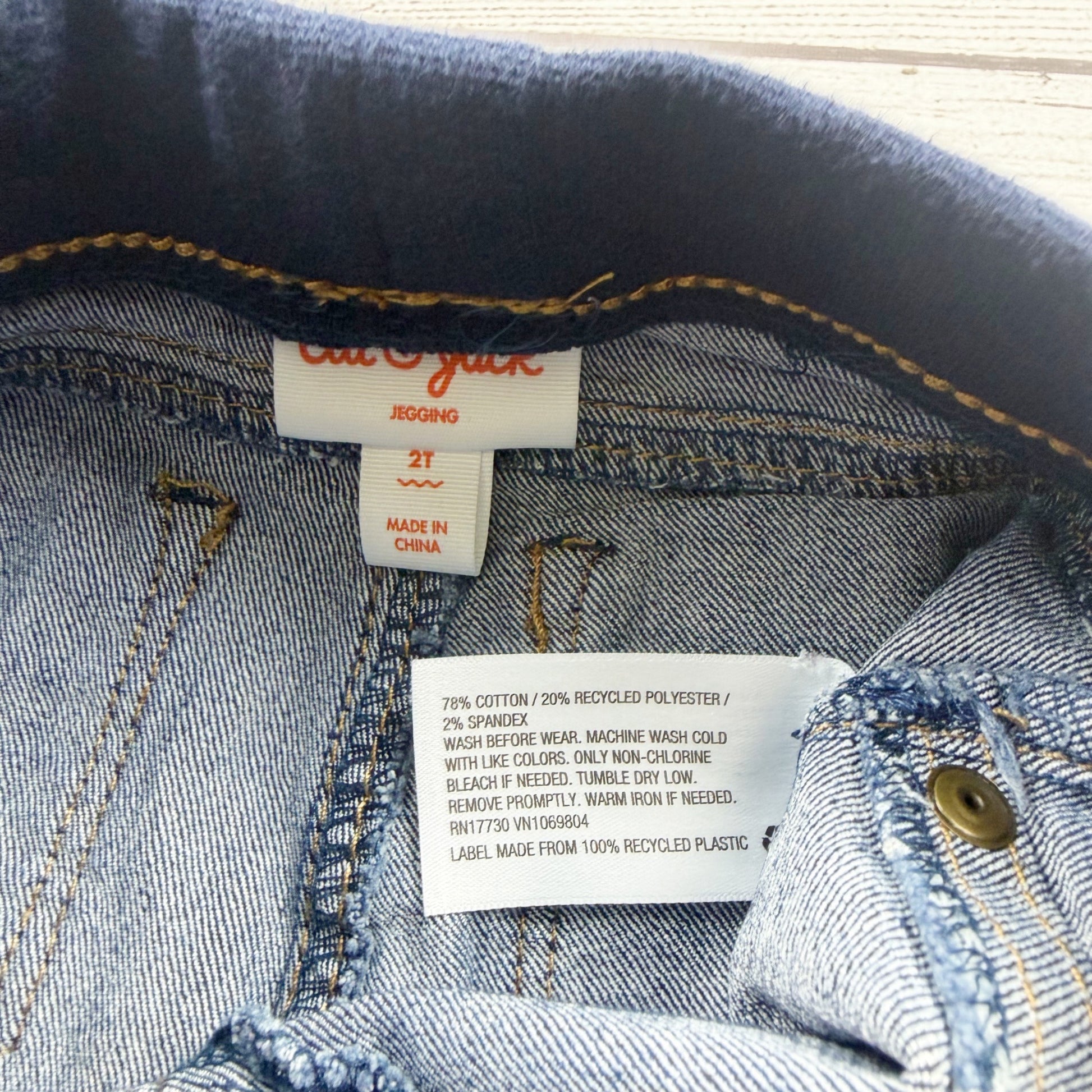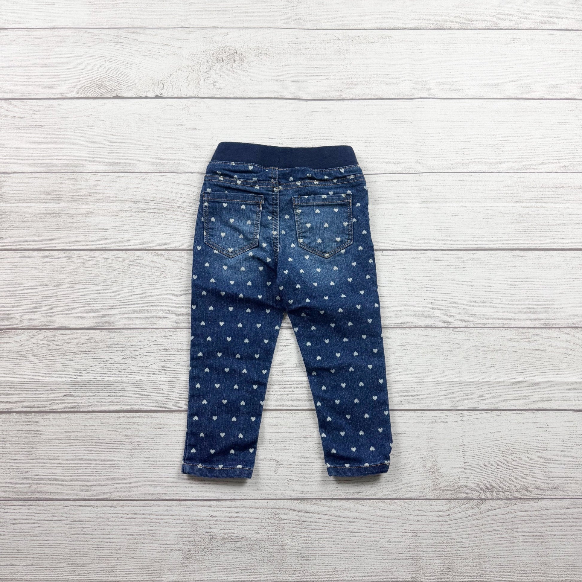 Blue denim jeggings with heart print. Cotton polyester spandex blend.
