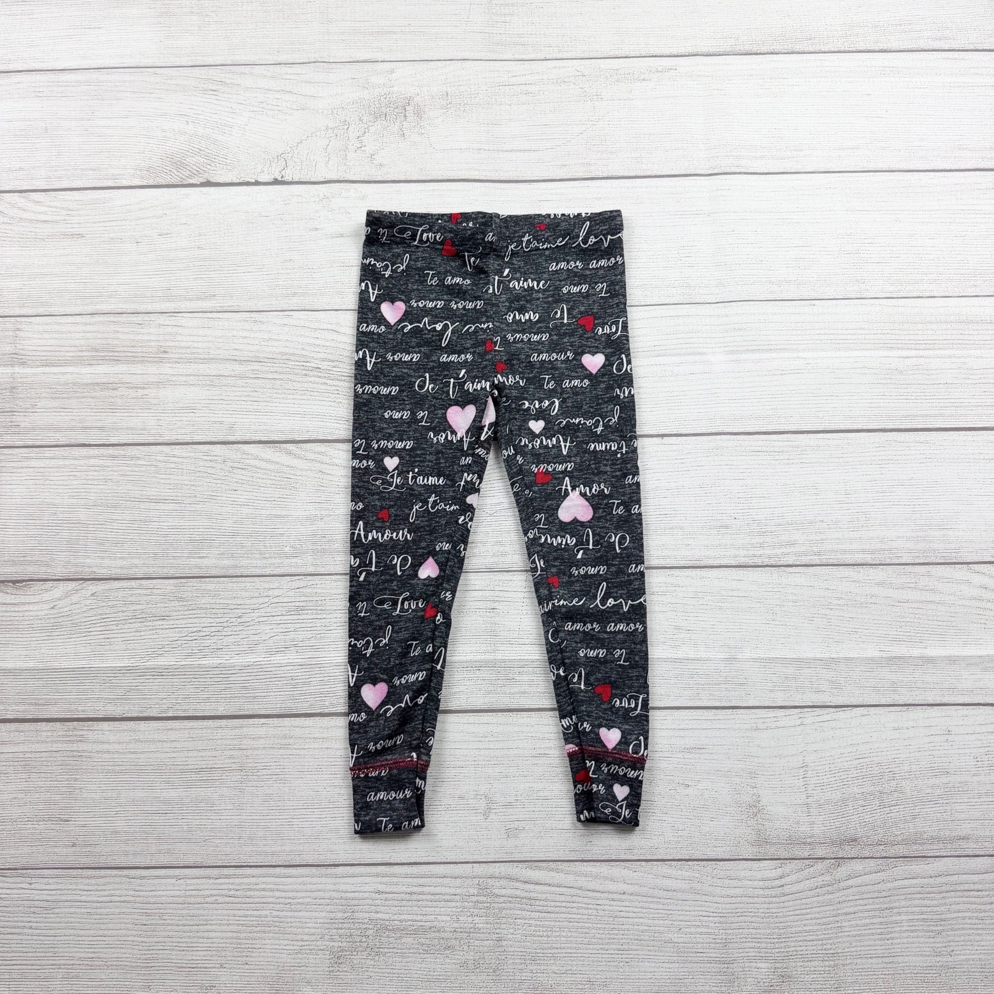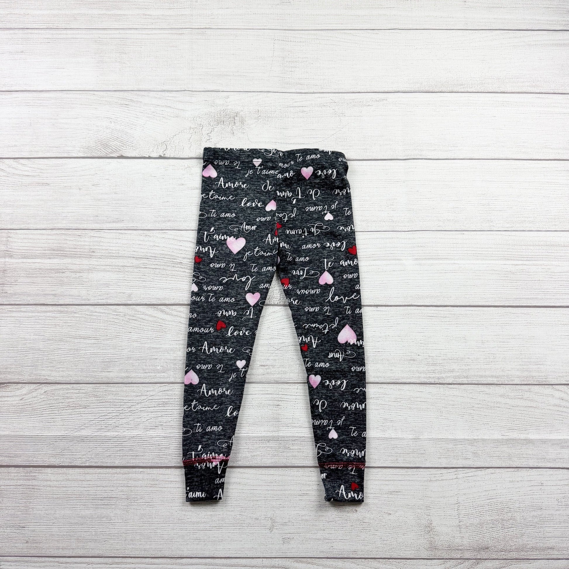 Short sleeve shirt with “love means family” graphic. Black pants with love print in various languages. Polyester spandex blend