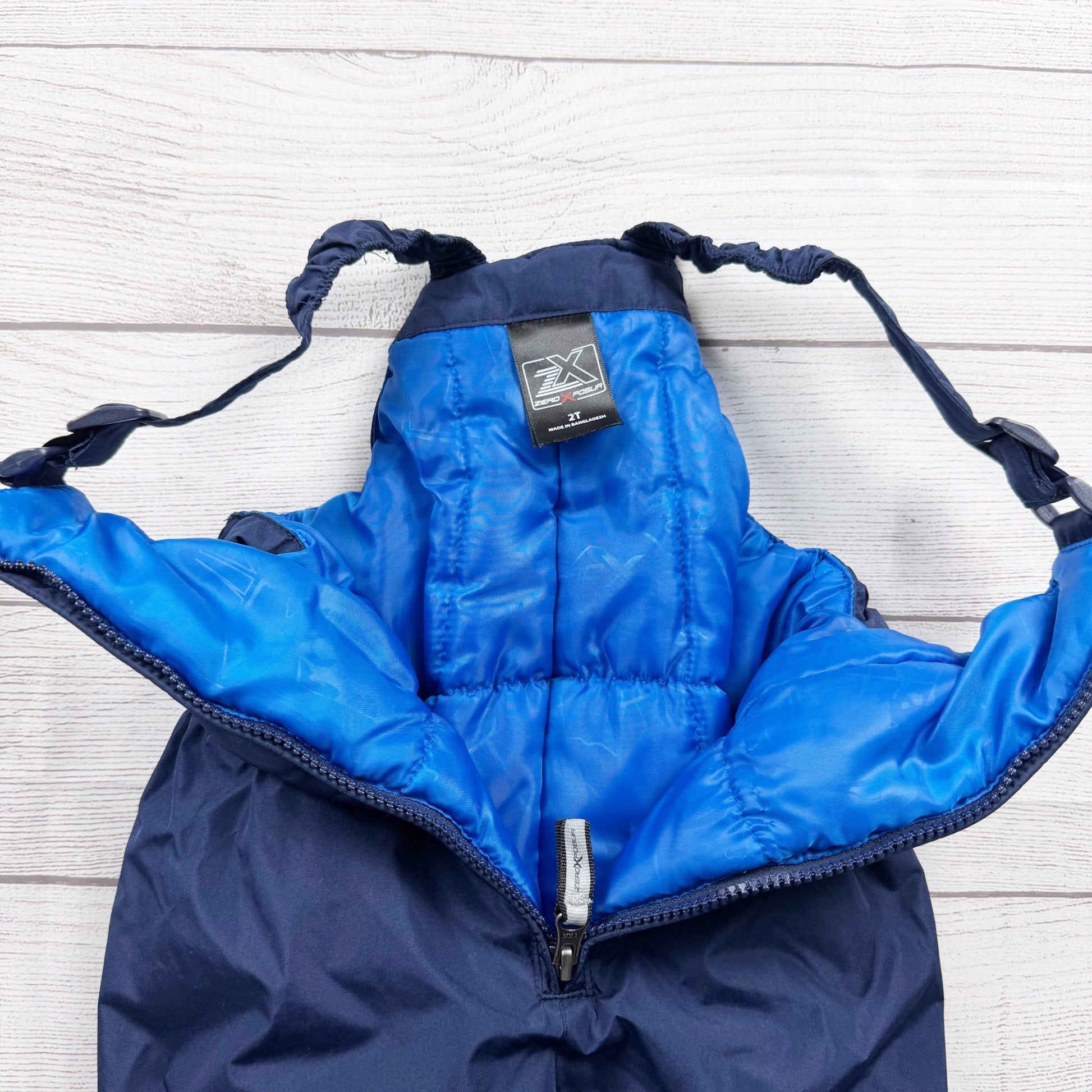 Zeroxposur2tBlue adjustable strap snowbib ski pants. Zips at front.