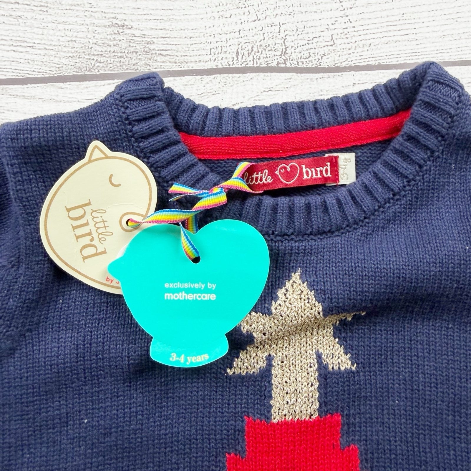 Blue long sleeve sweater with colorful holiday tree and sleeve cuffs. Cotton