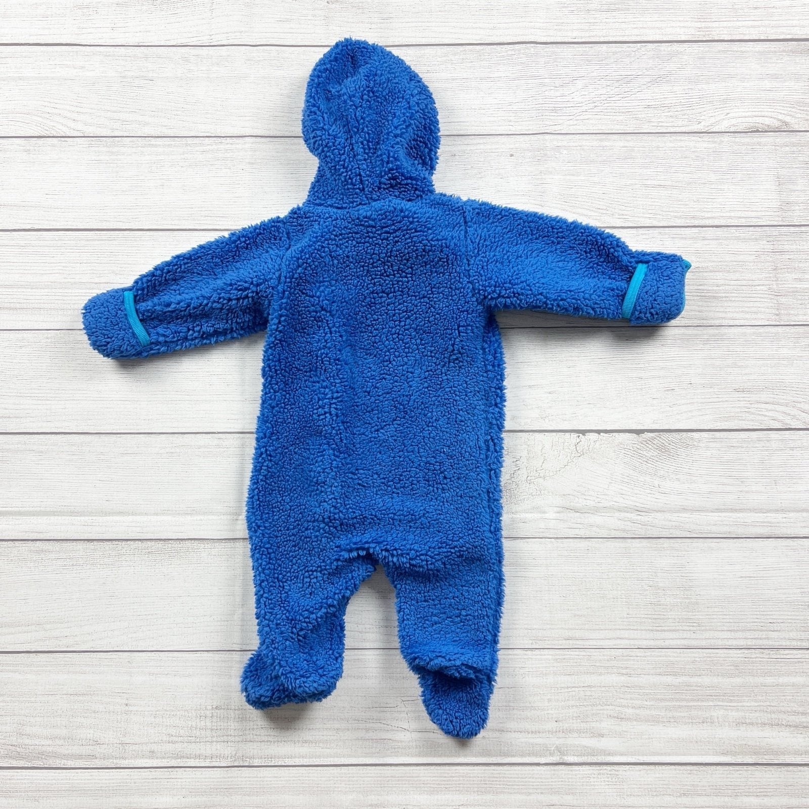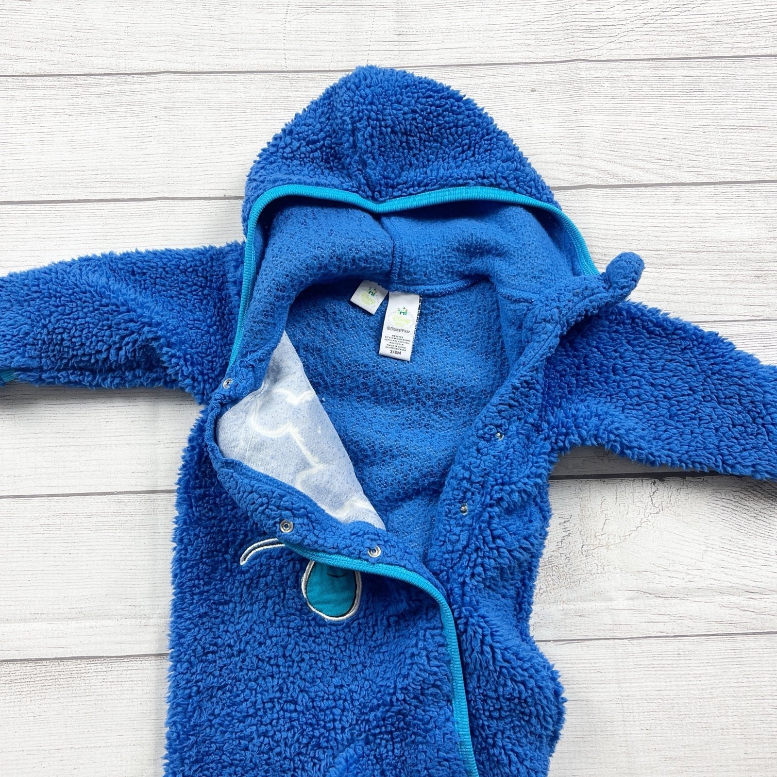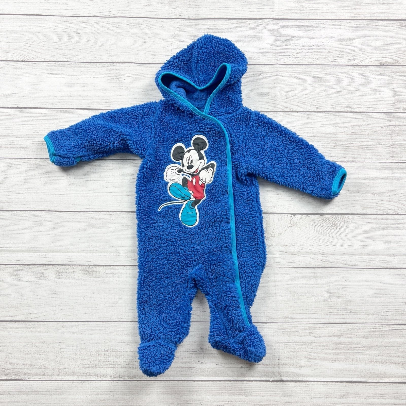 Blue long sleeve snap up fleece footed hoodie hooded one piece bunting with Mickey appliqué on front. Polyester