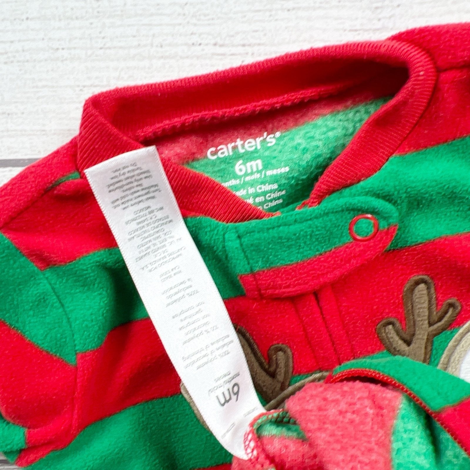 Red and green striped fleece long sleeve zip up footed sleep and play pajamas. Reindeer face at center. Polyester