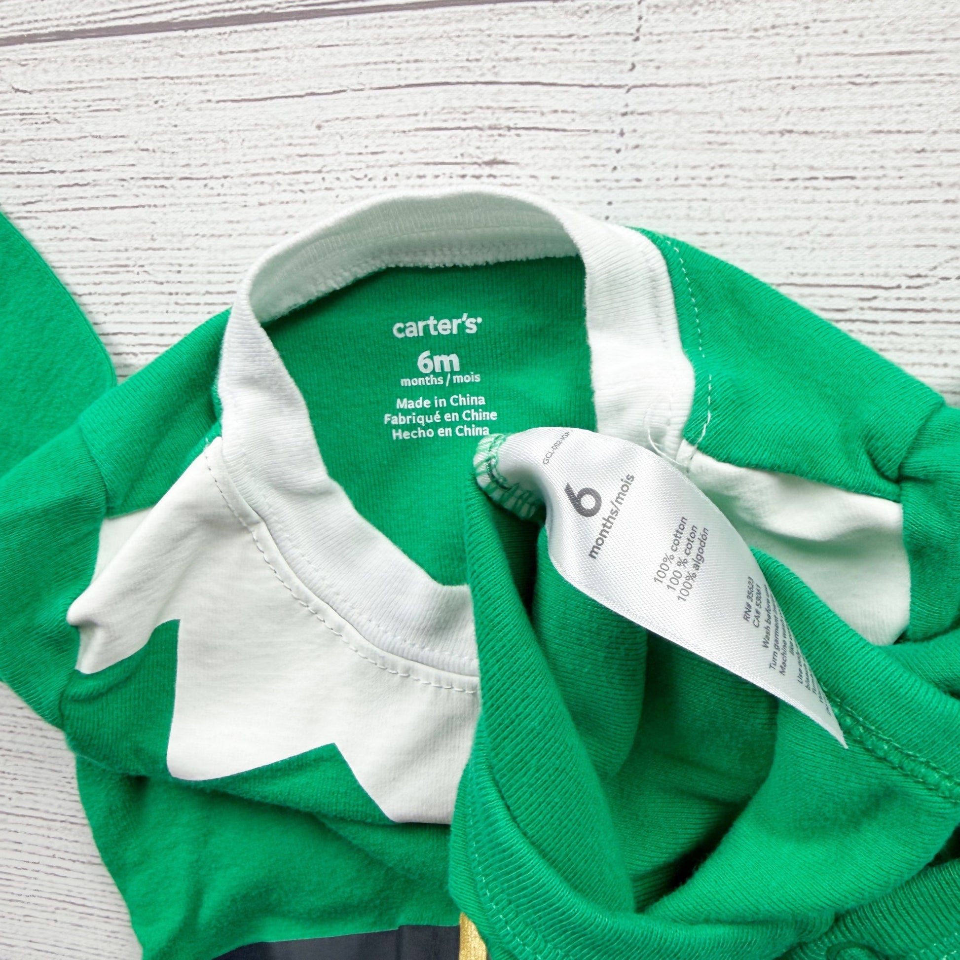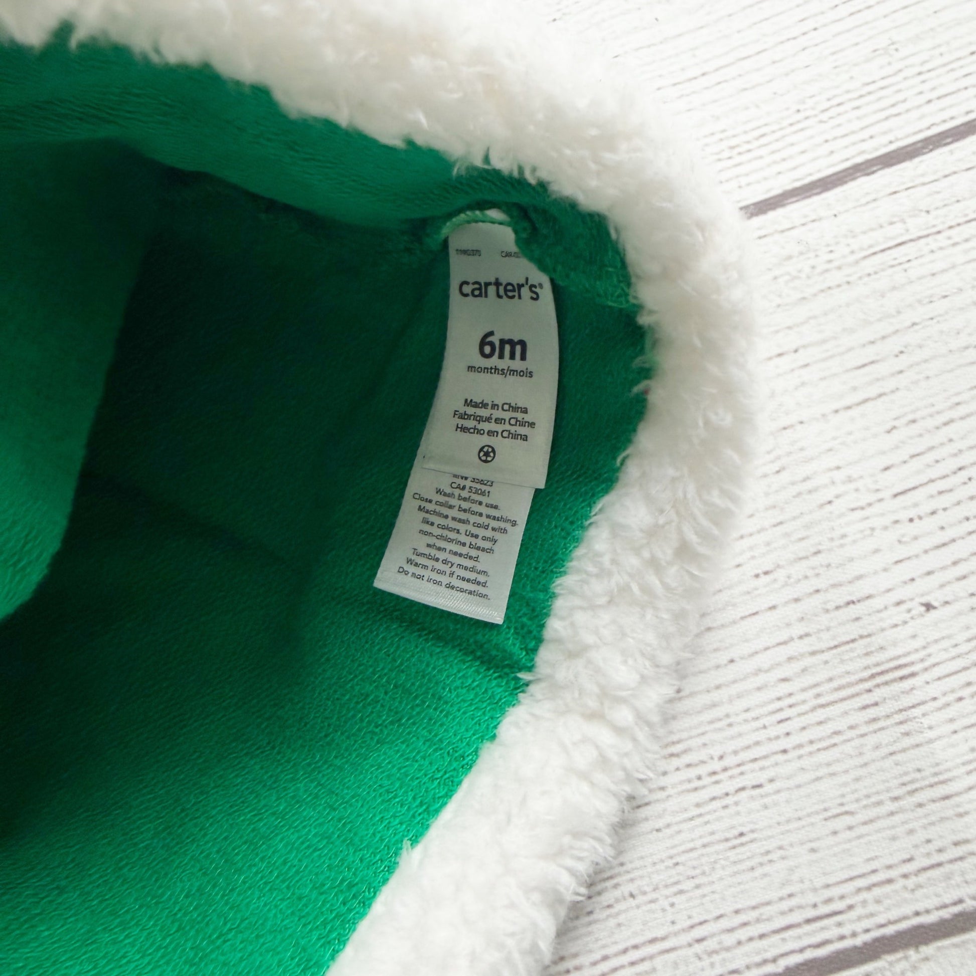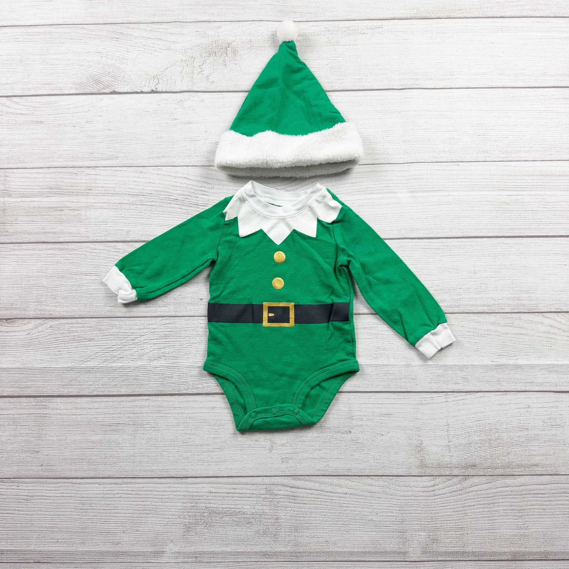 Green elf graphic theme long sleeve onesie with matching hat. Cotton