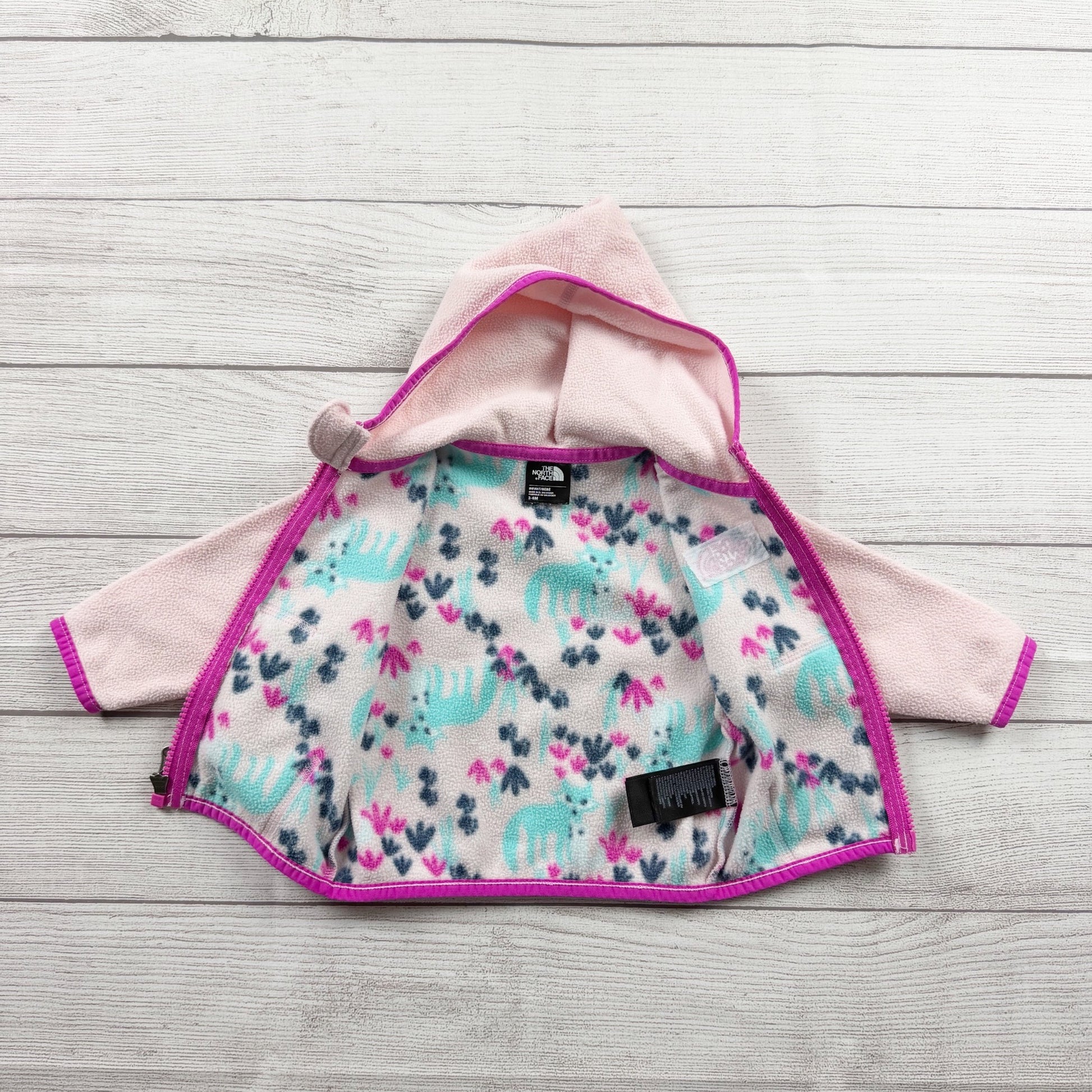 Pink long sleeve hooded full zip jacket with colorful woodland nature fox print. Polyester