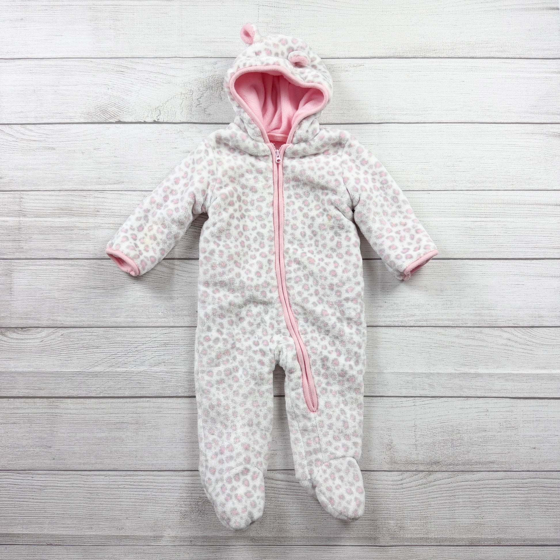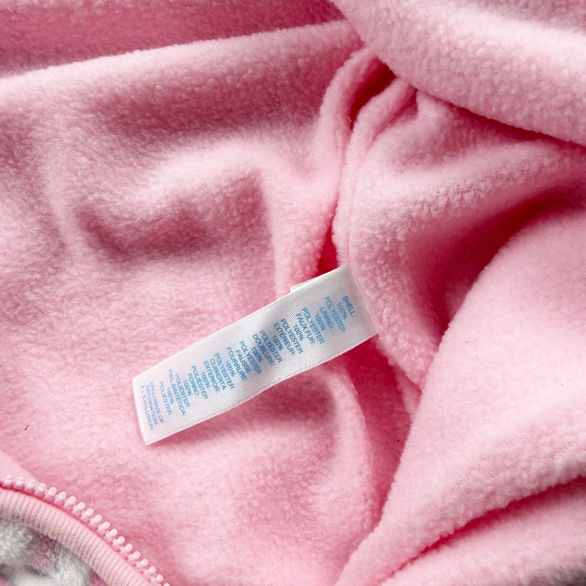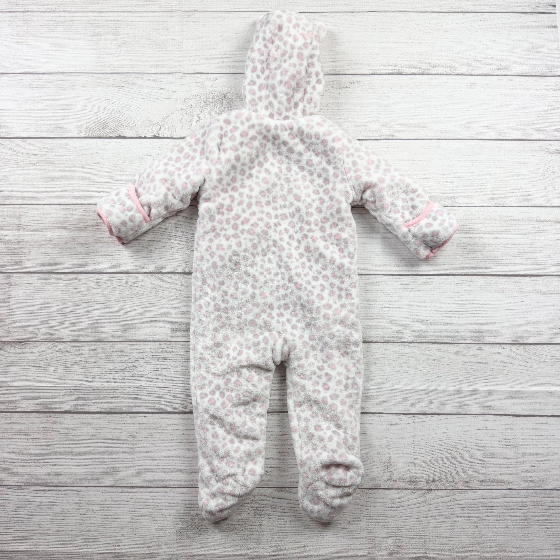 Cheetah leopard print long sleeve hooded and footed zip up fleece bunting. Hands can be covered. Polyester