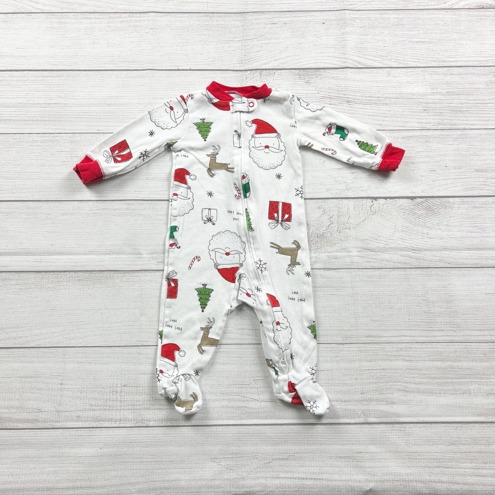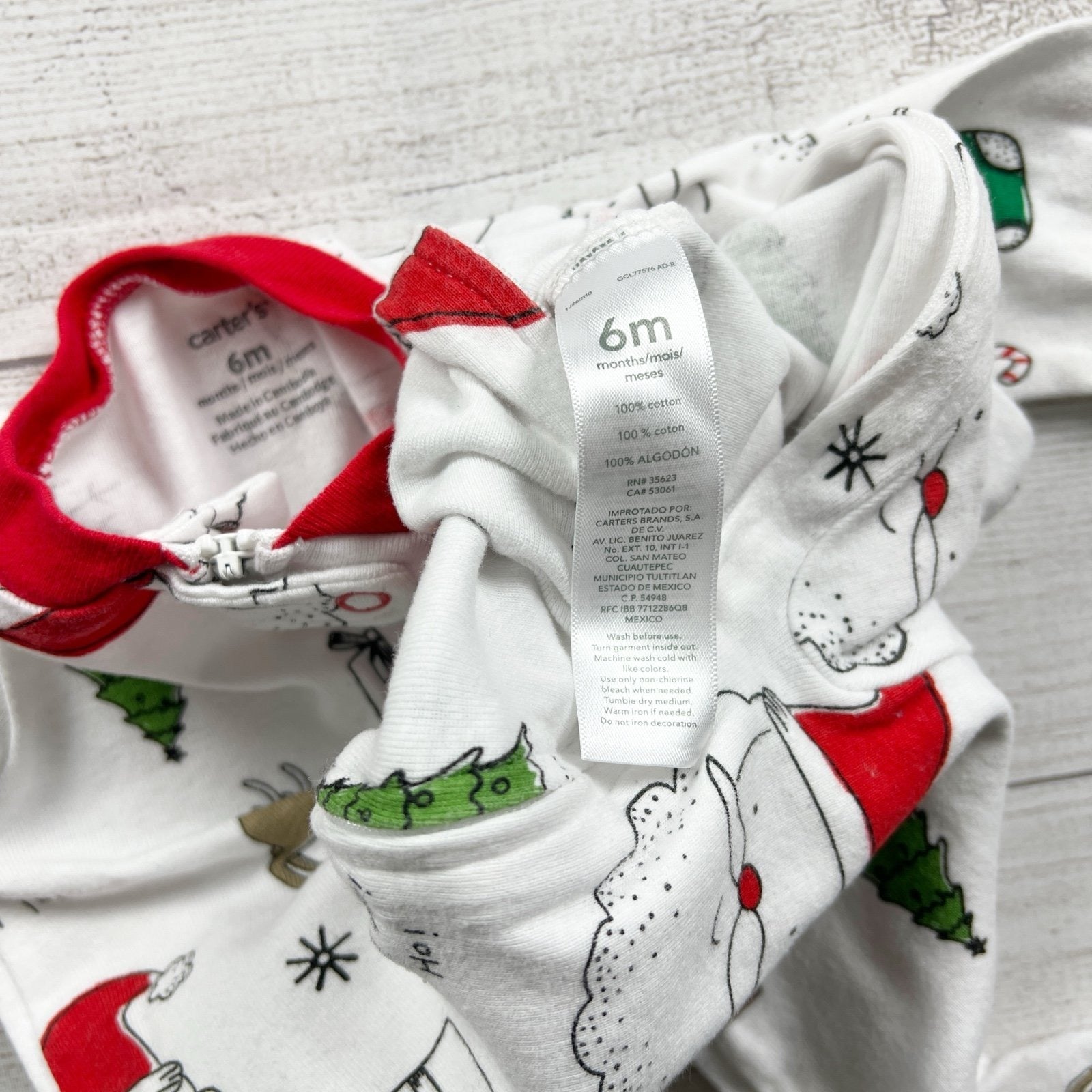 Long sleeve zip up footed sleep and play pajamas in white with red trim. Print includes holiday Christmas Santa presents trees etc