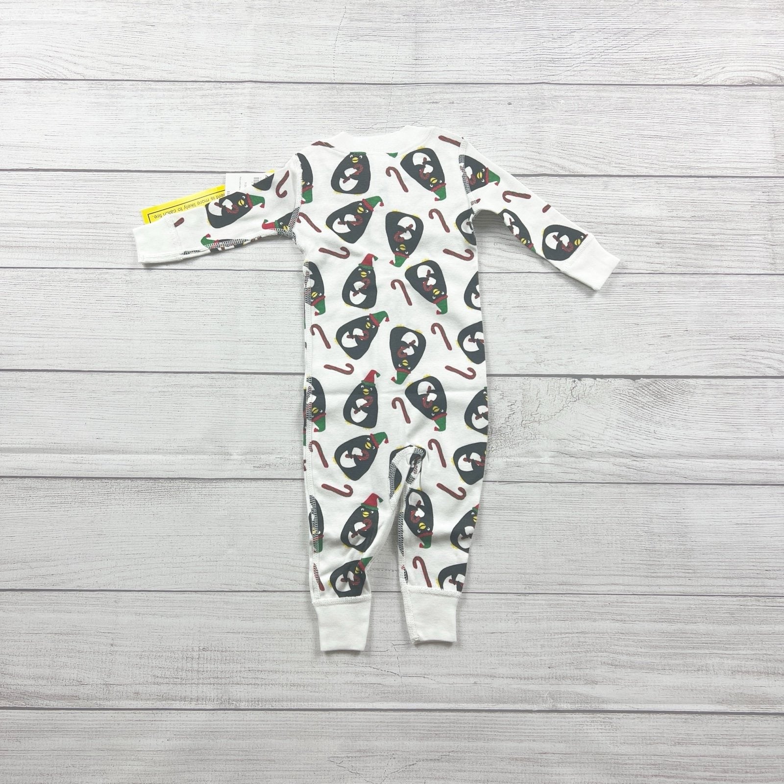 White long sleeve zip up one piece sleep and play pajamas with holiday Christmas penguin print. Organic cotton