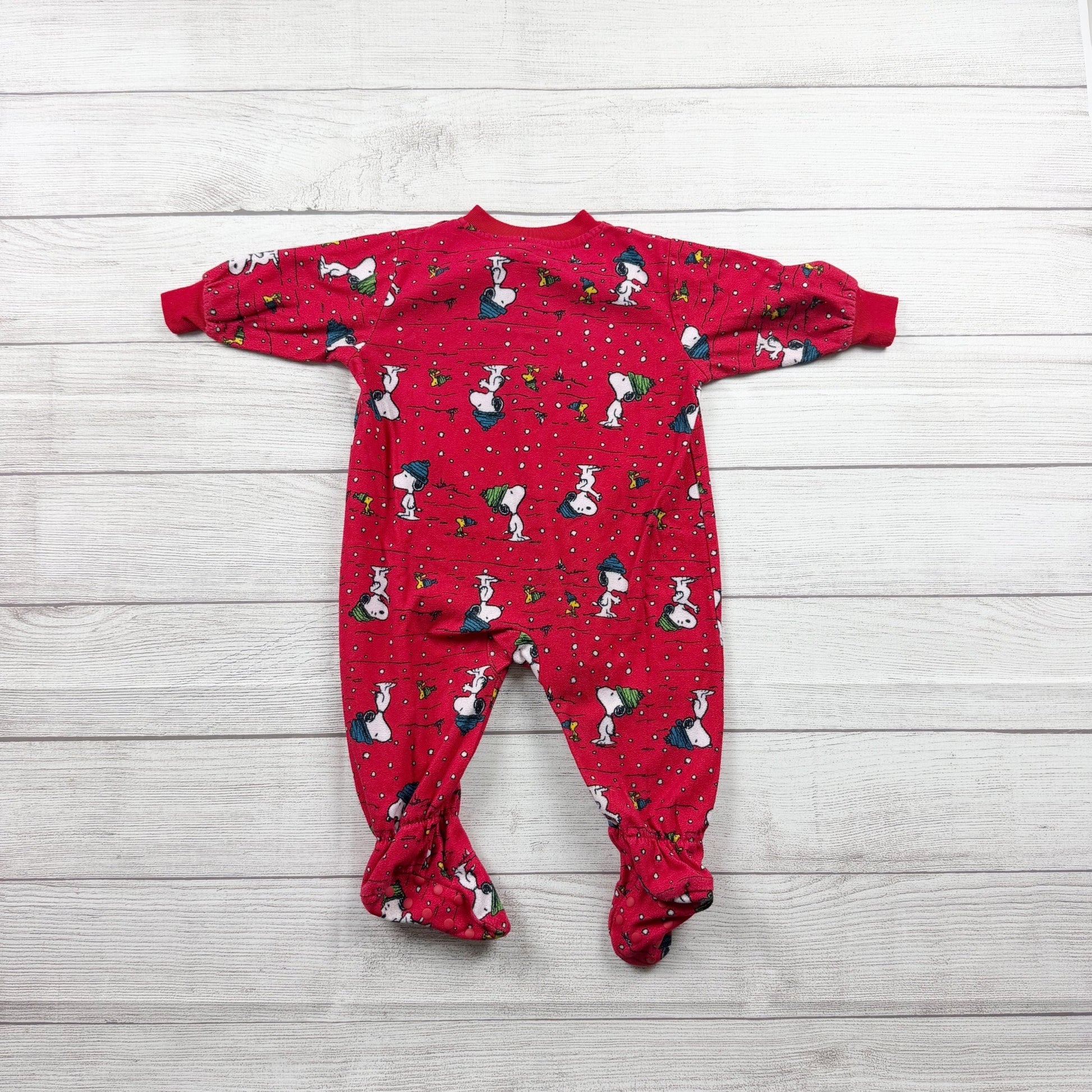Red long sleeve zip up footed pajamas with holiday Christmas snoopy, Woodstock, and lights print. Polyester