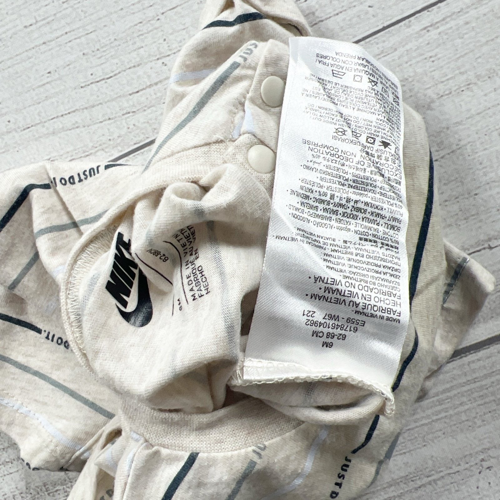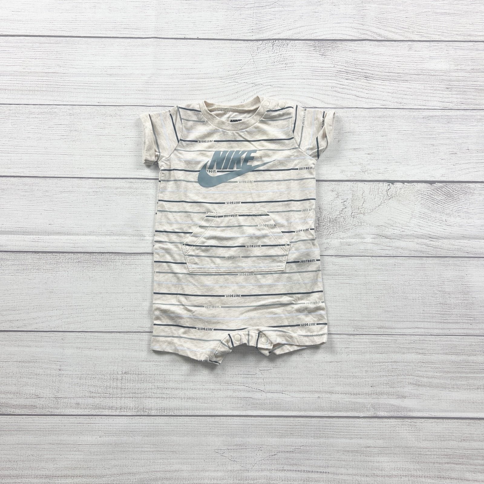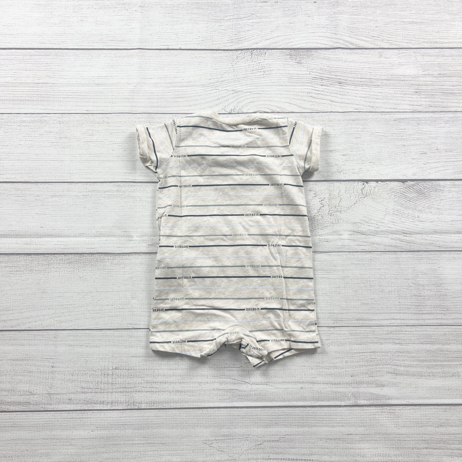 One piece neutral stripe short sleeve and shorts romper. Snaps at legs and shoulder. Cotton polyester blend