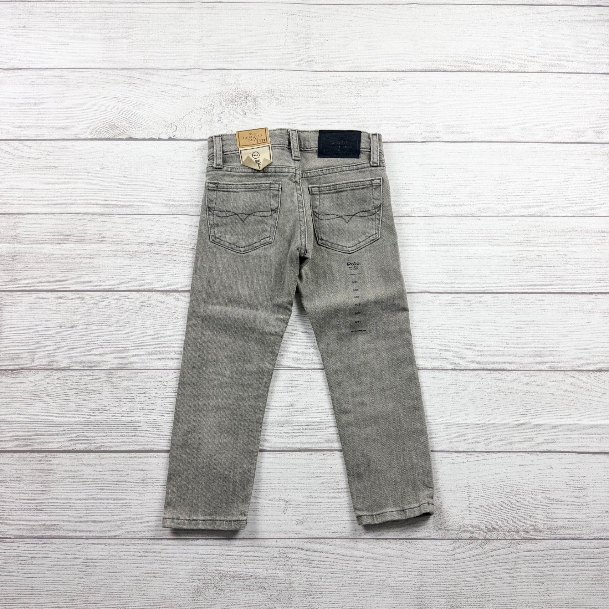 Gray wash denim jeans with adjustable waist. Cotton blend