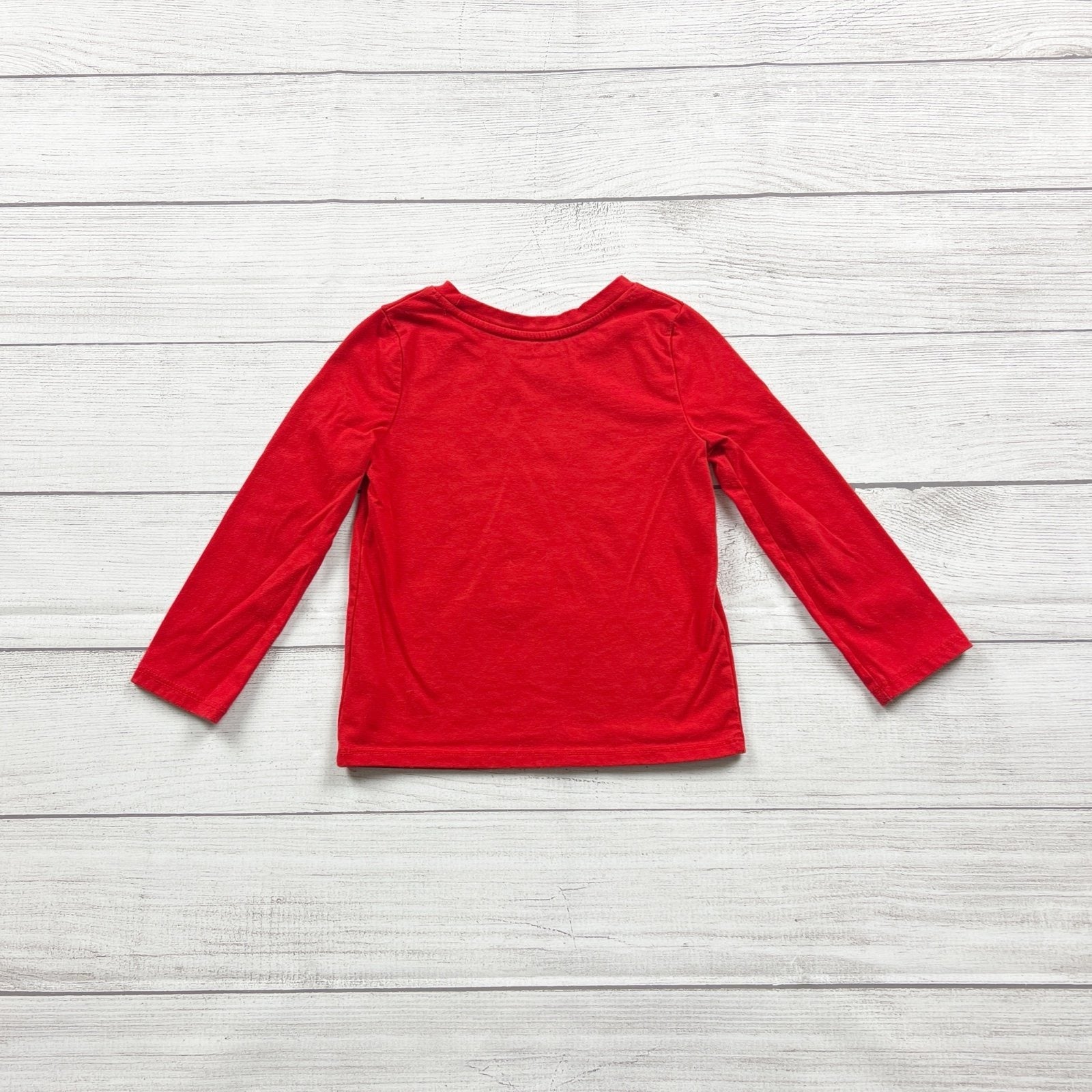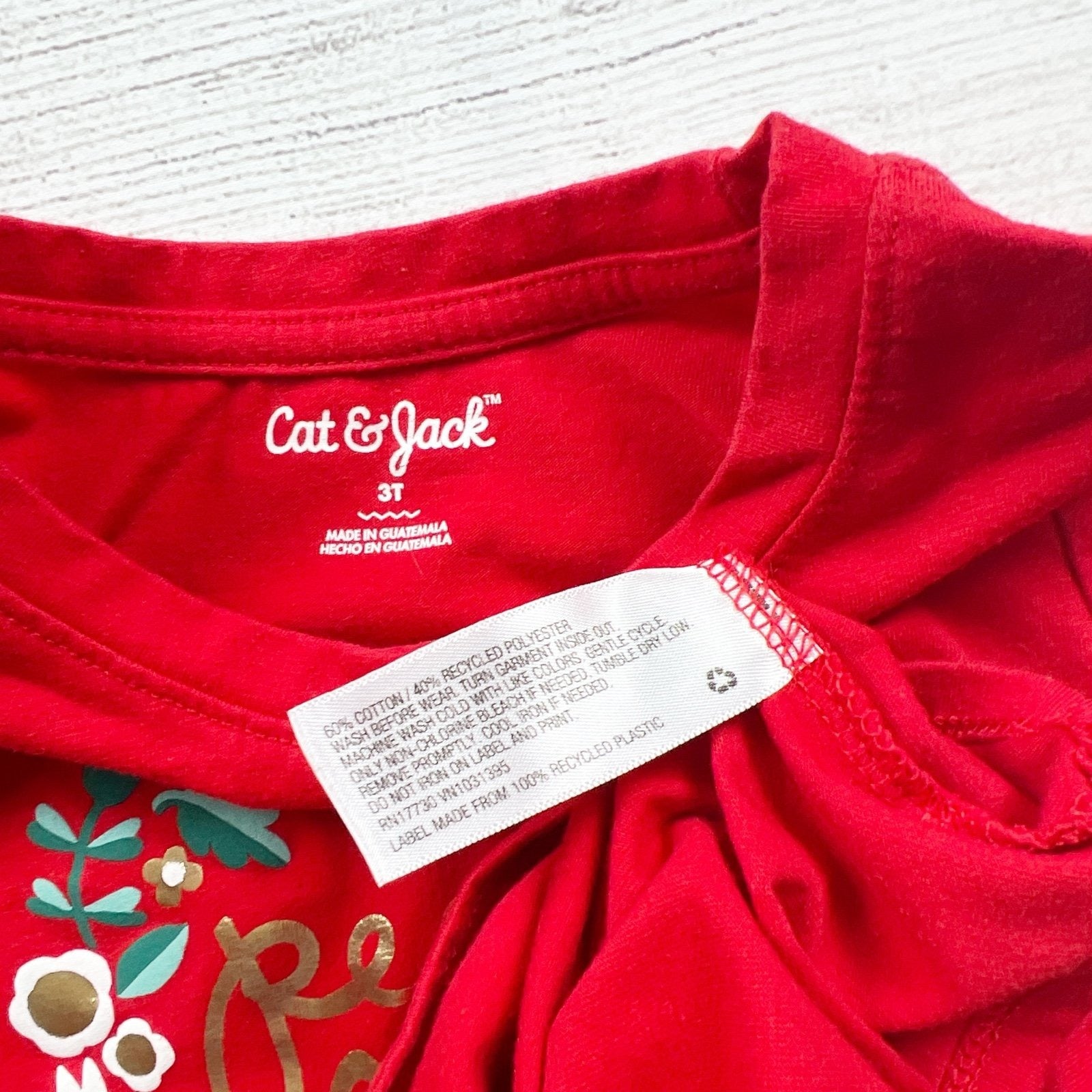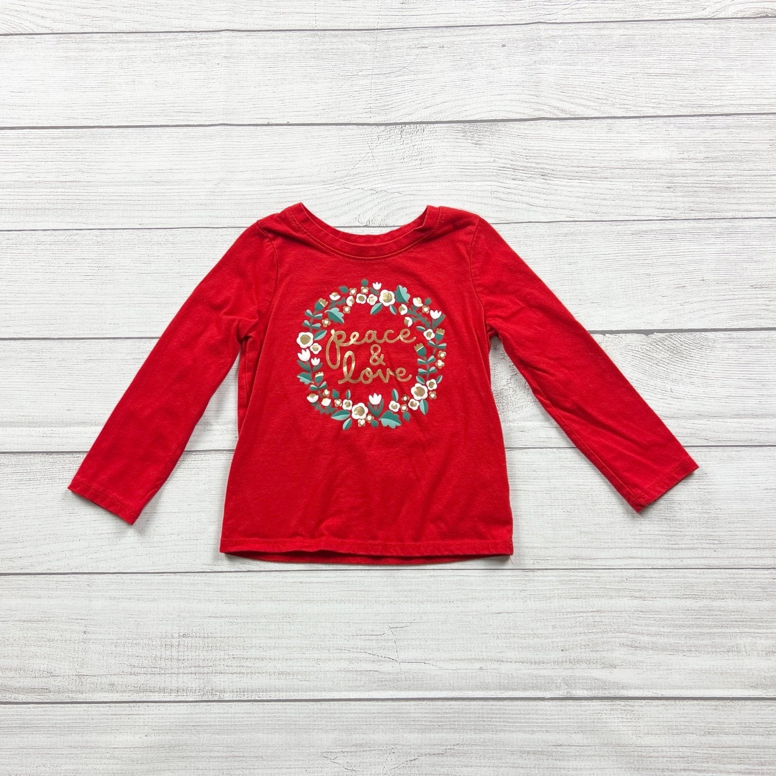 Red long sleeve shirt with “peace & love” floral wreath graphic. Cotton polyester blend