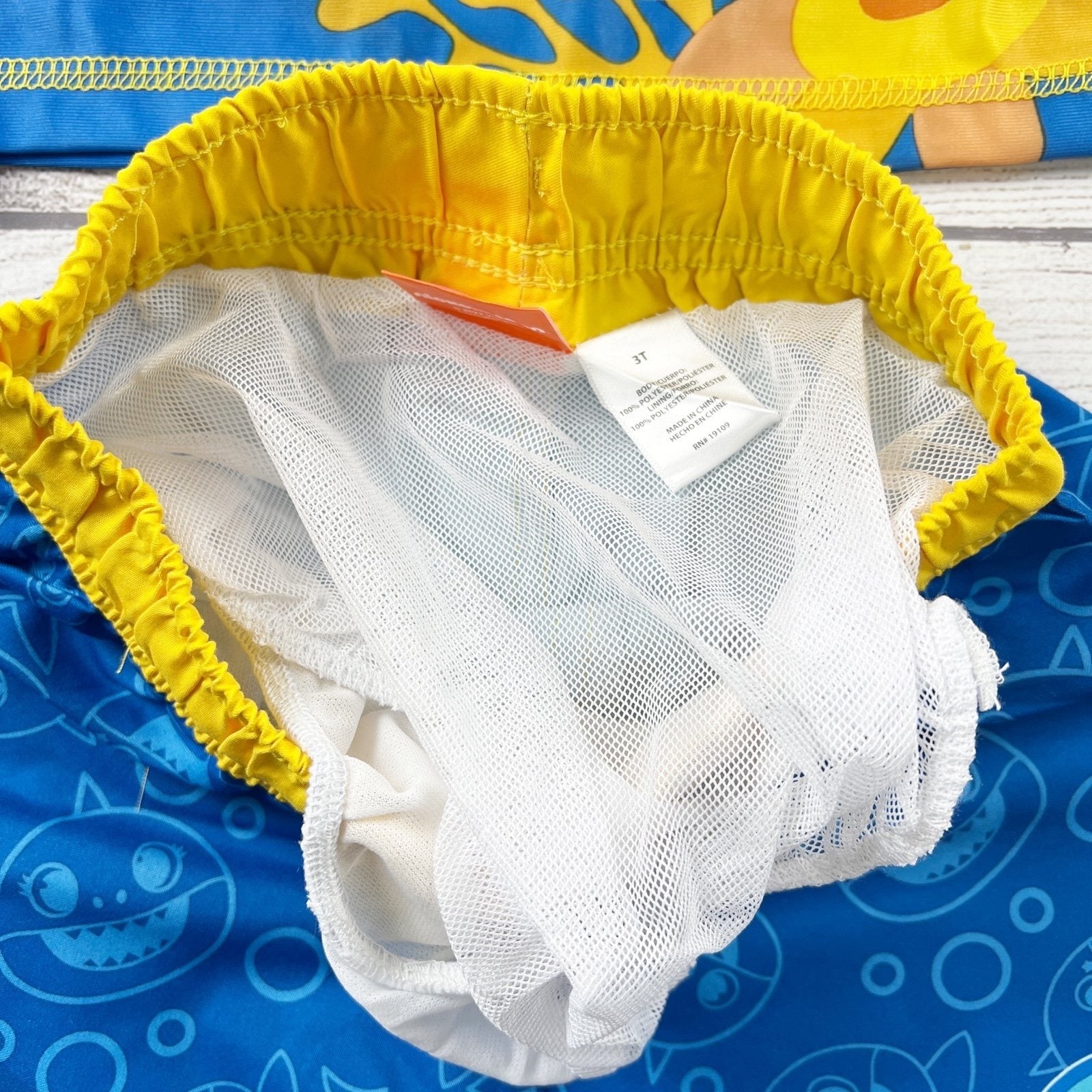 Shades of blue and yellow two piece swimsuit. Short sleeve rashguard rash guard with baby shark characters on front. Board shorts with shark face print. Lining. UPF 50