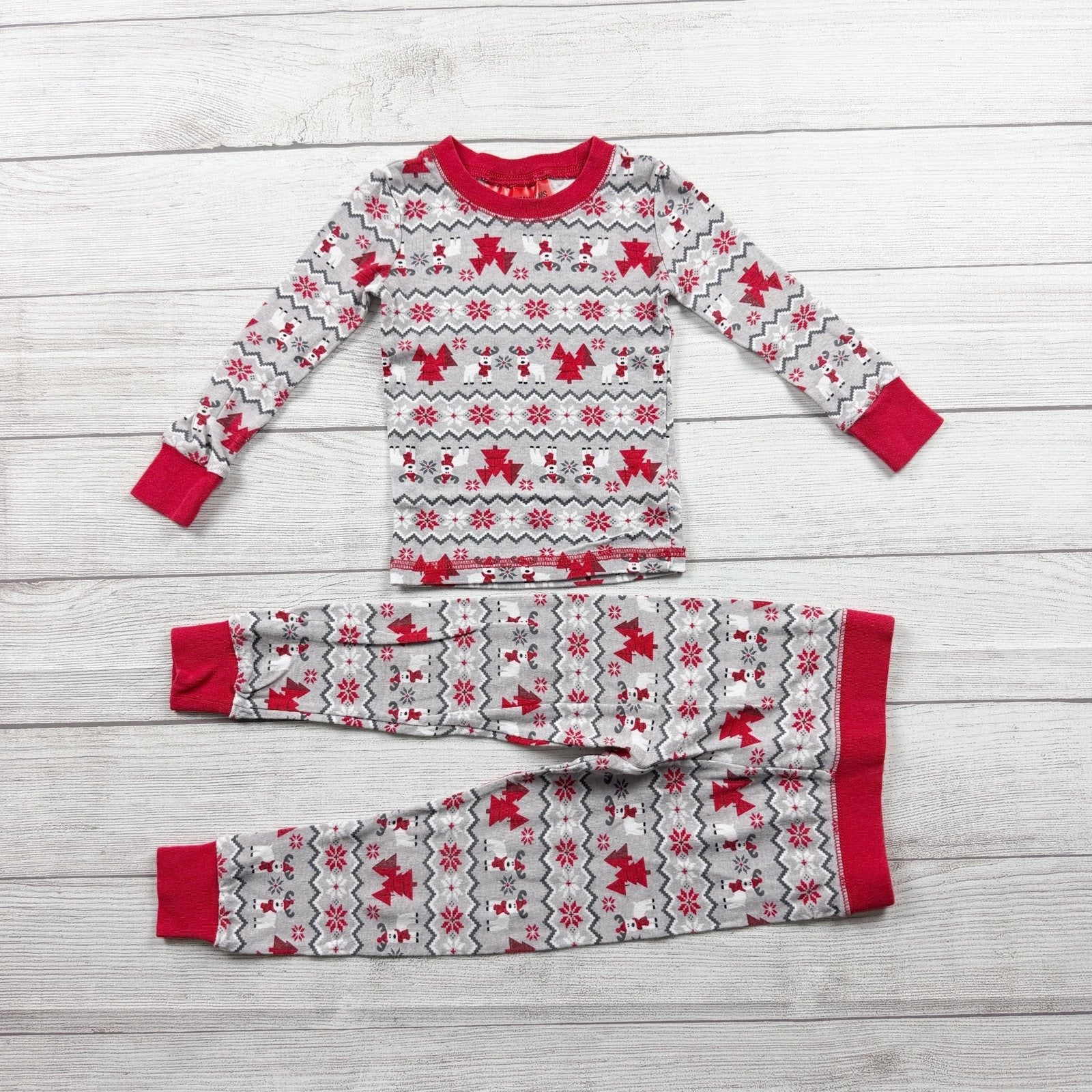 Grey gray long sleeve shirt and pants pajama set with reindeer and winter theme Fairisle print. Cotton