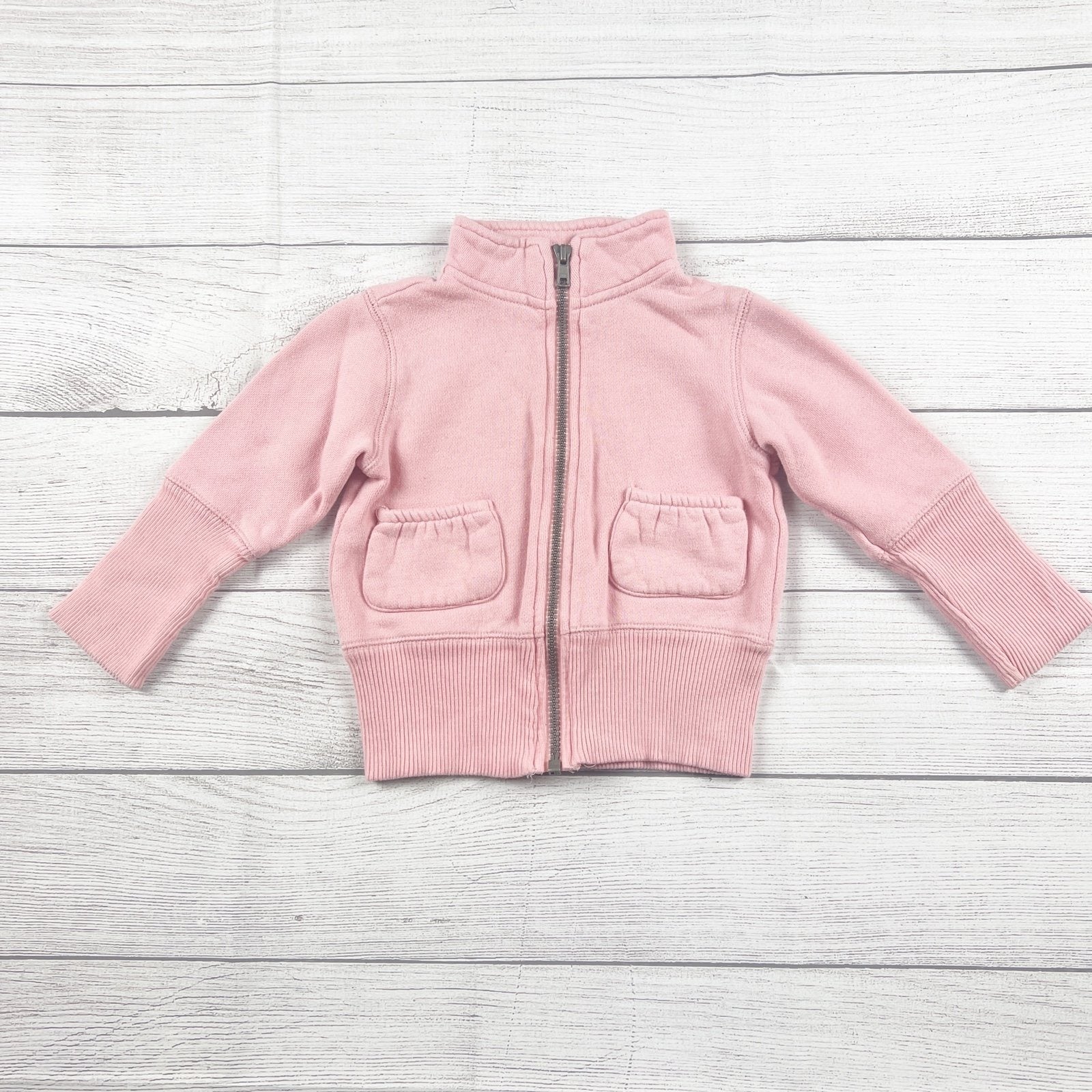 Solid pink long sleeve zip up sweatshirt jacket with front pockets. Cotton polyester blend
