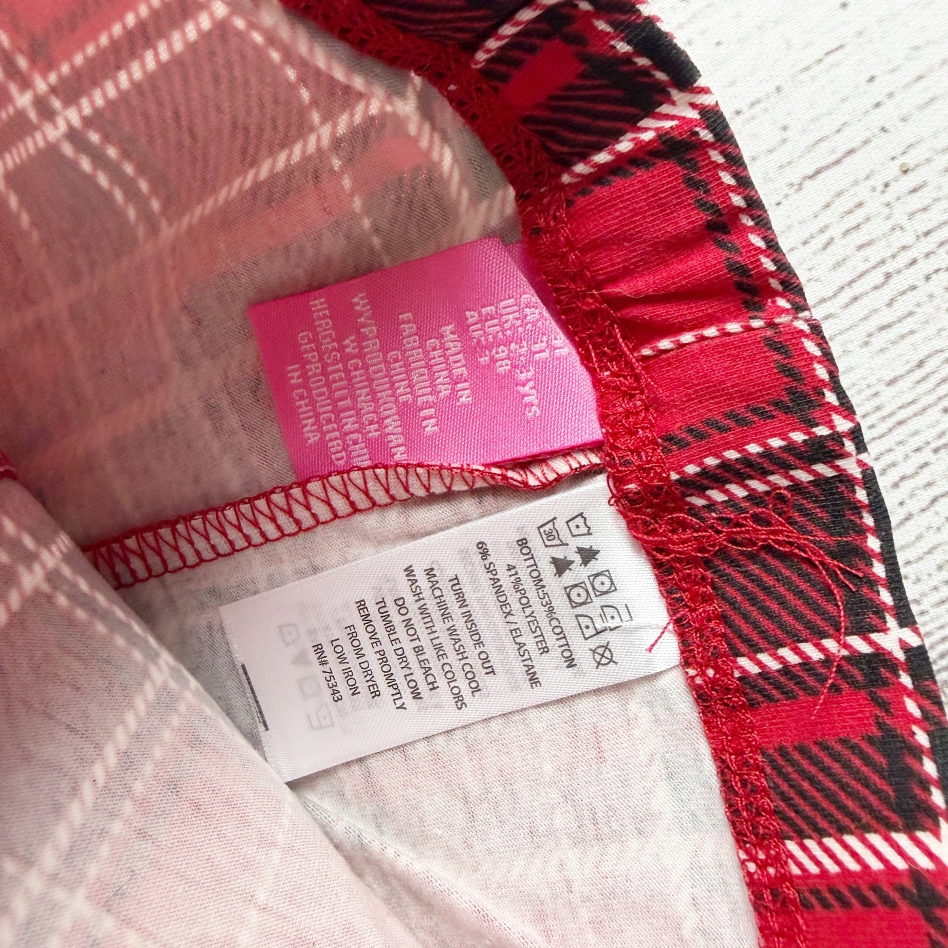 Three piece outfit. Red plaid leggings. Black long sleeve peplum shirt with buttons at back. White faux fur fleece vest.