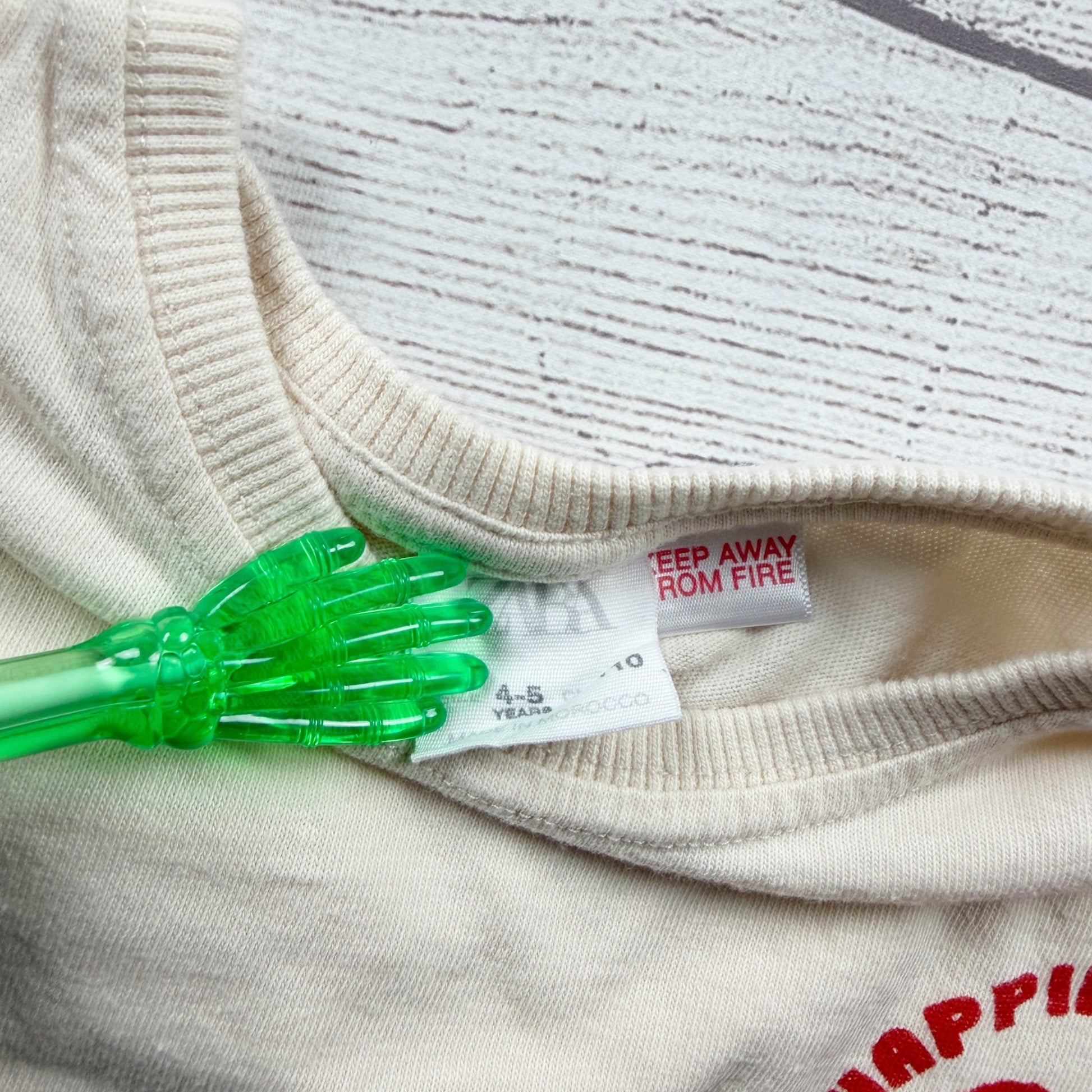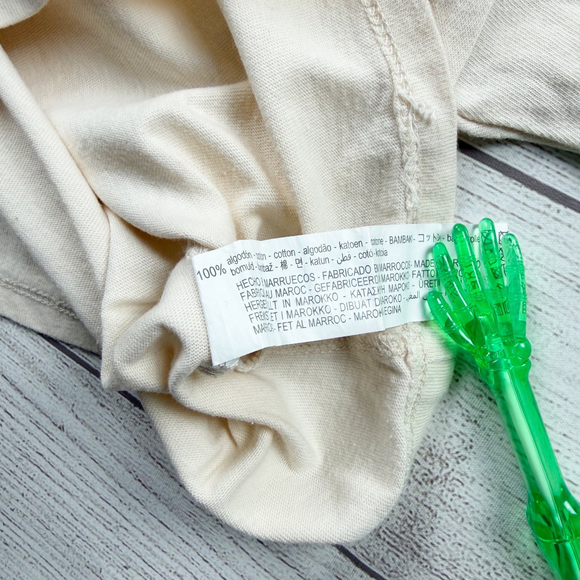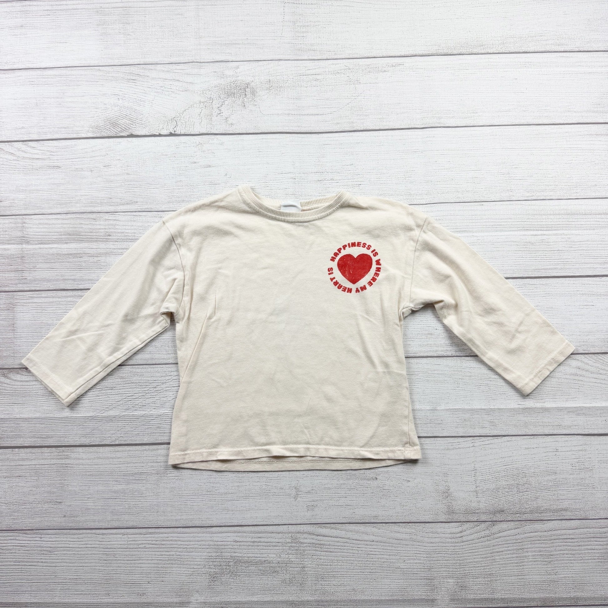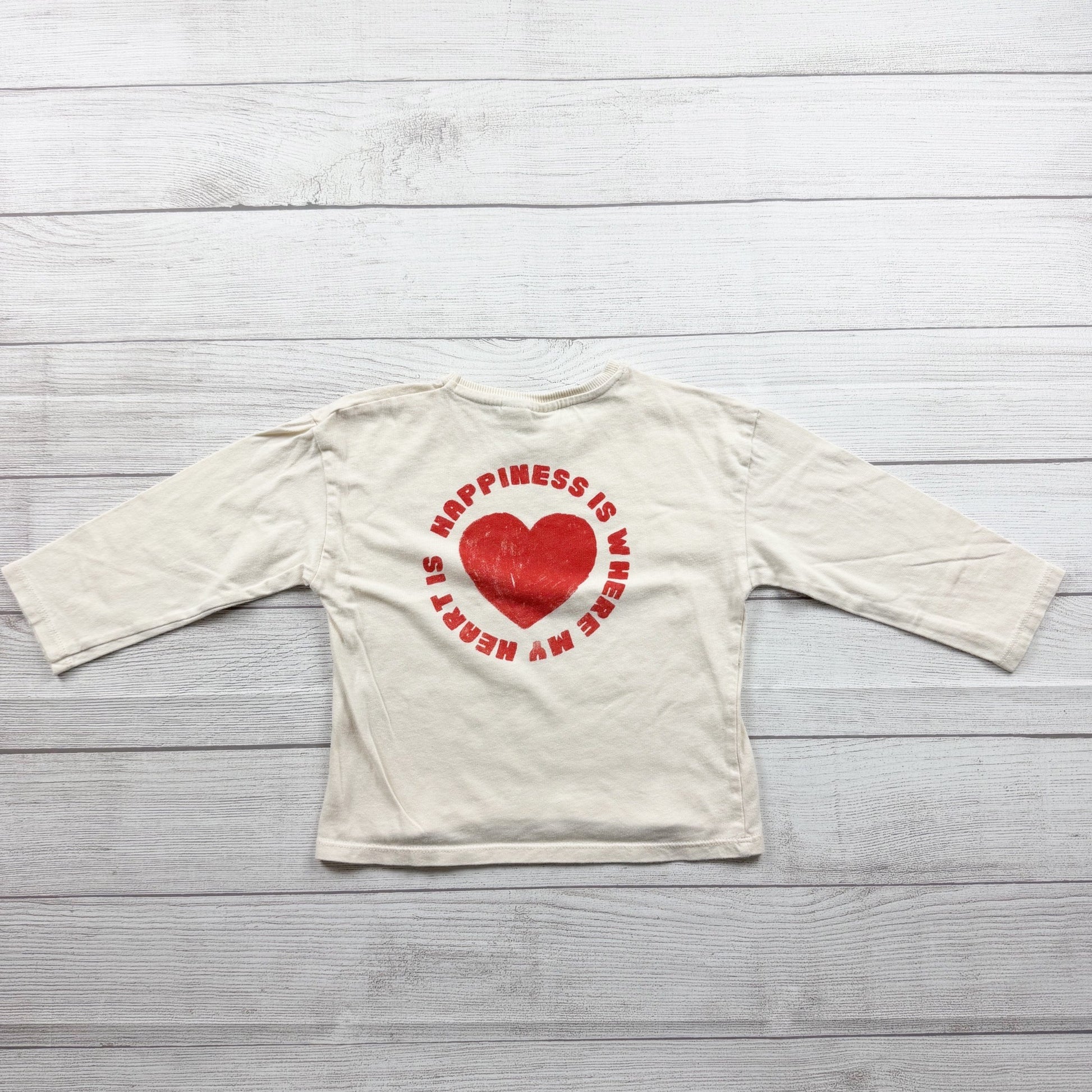 Cream beige long sleeve shirt with heart “happiness is where my heart is” graphic at chest and back. Cotton