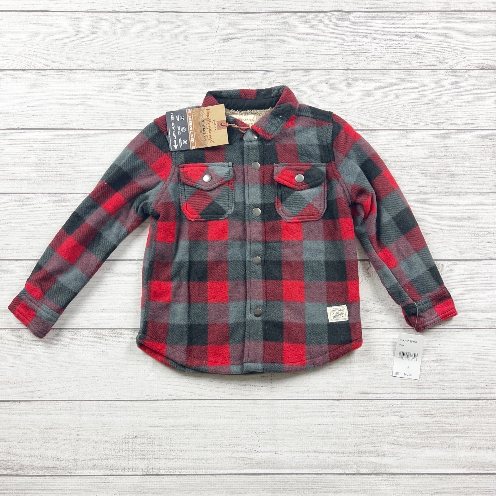 Red grey gray and black plaid long sleeve snap Shacket jacket with brown Sherpa fleece lining and collar.
