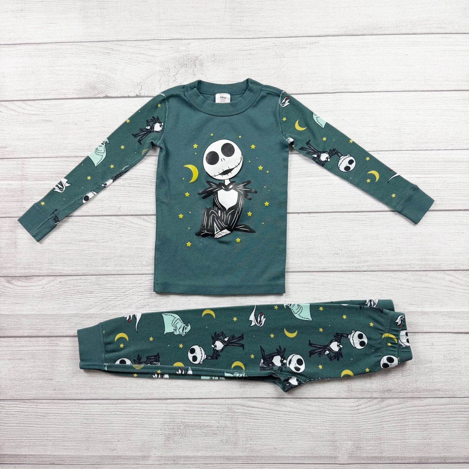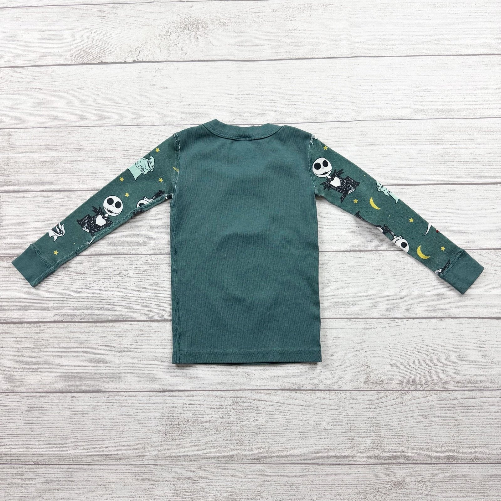 Teal Long sleeve shirt and pants pajamas set with Jack Skellington print and chest graphic. Organic cotton. Christmas. Holiday