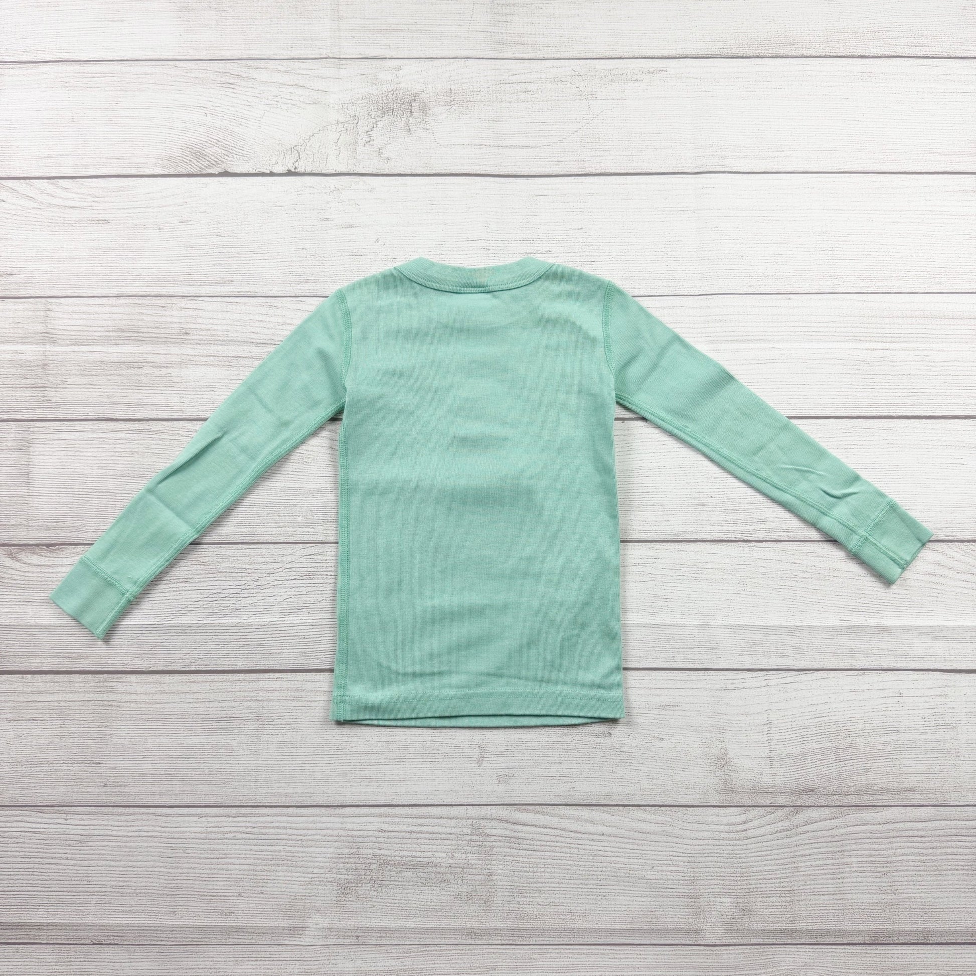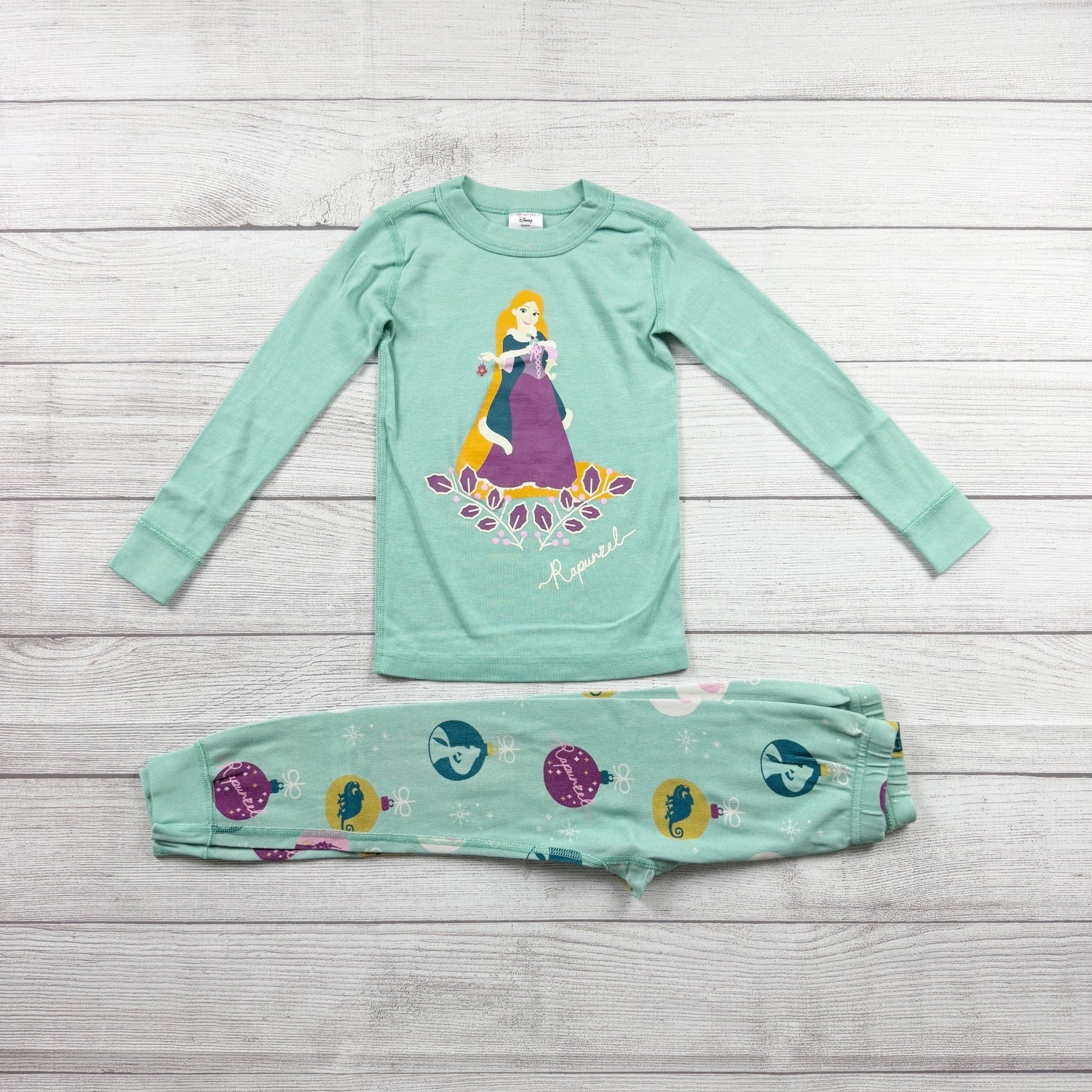 Long sleeve shirt and long pants pajama set with Rapunzel graphic. Pants have themed Christmas holiday ornaments. Organic cotton