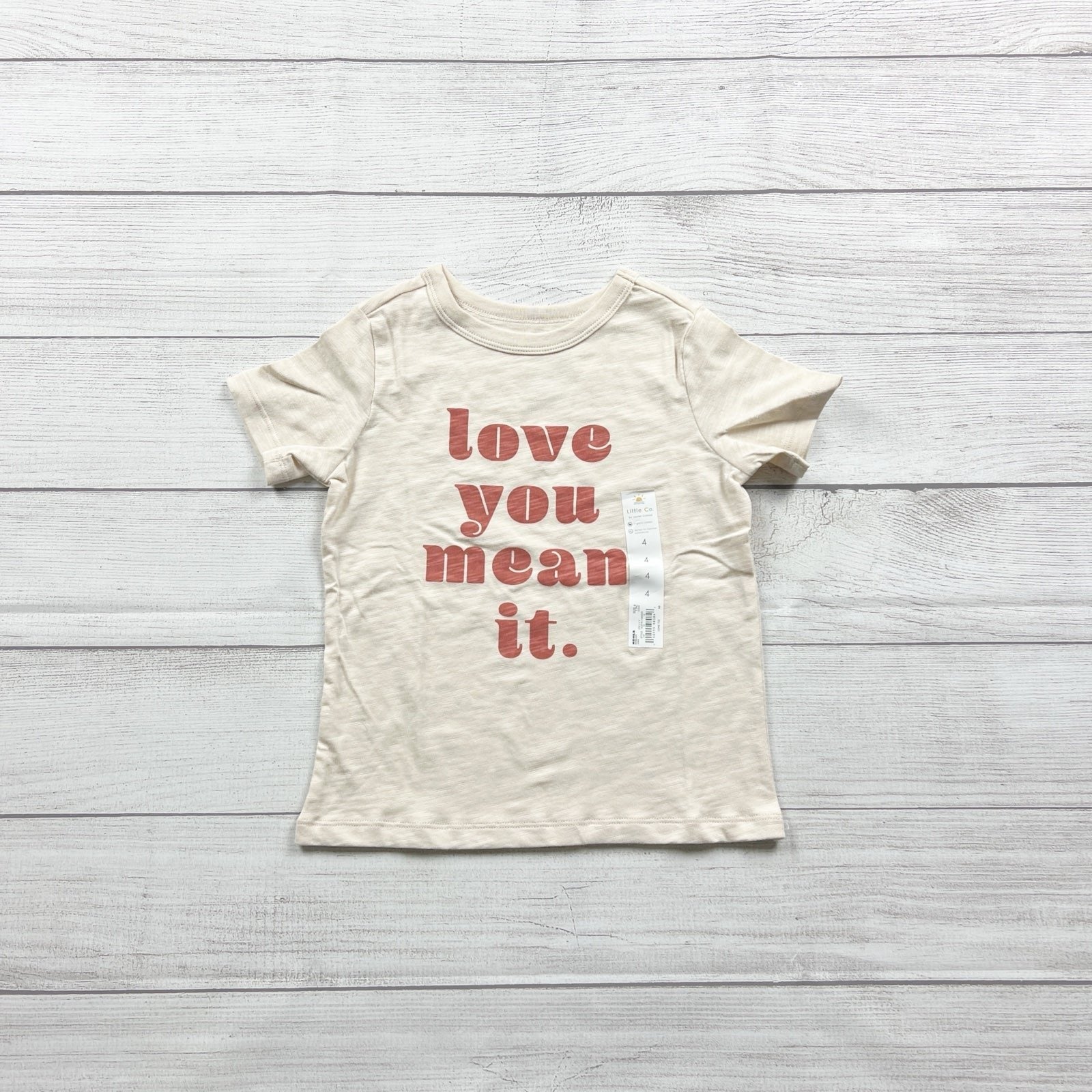 Beige short sleeve shirt with “love you mean it” graphic on front. Organic cotton