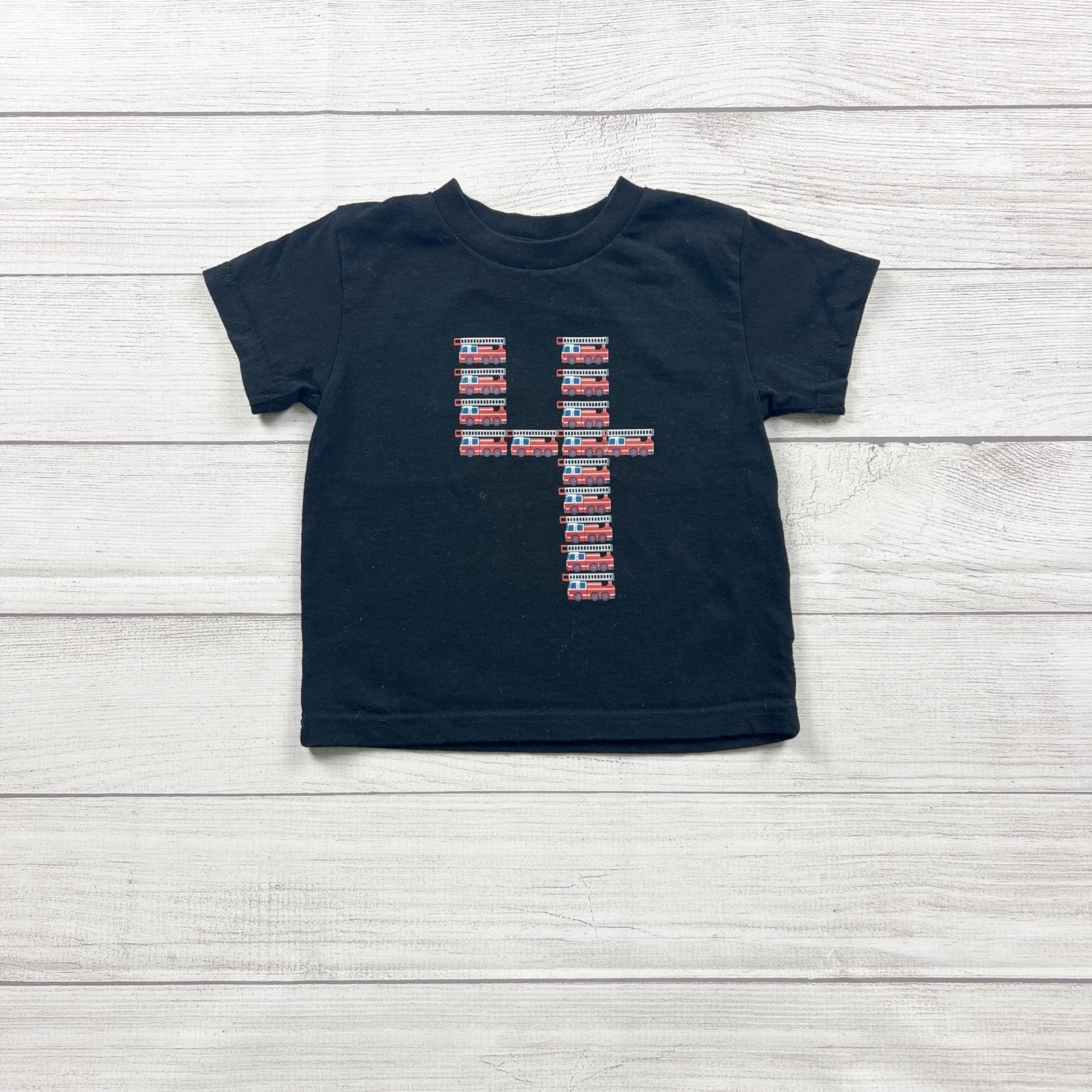 Black short sleeve shirt with Firetrucks in shape of number four 4 graphic. Cotton