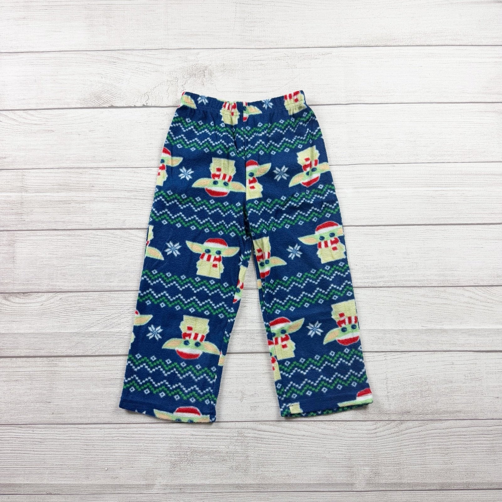 Blue and grey gray long sleeve raglan style shirt with holiday Christmas baby yoda Grogu graphic. Matching fleece fairisle print pants. Polyester