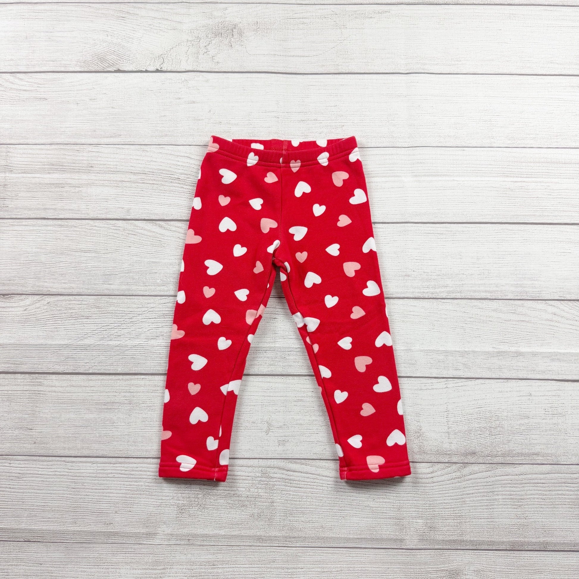 Red cozy light fleece lined leggings with heart print. Valentine’s Day. Polyester elastane blend